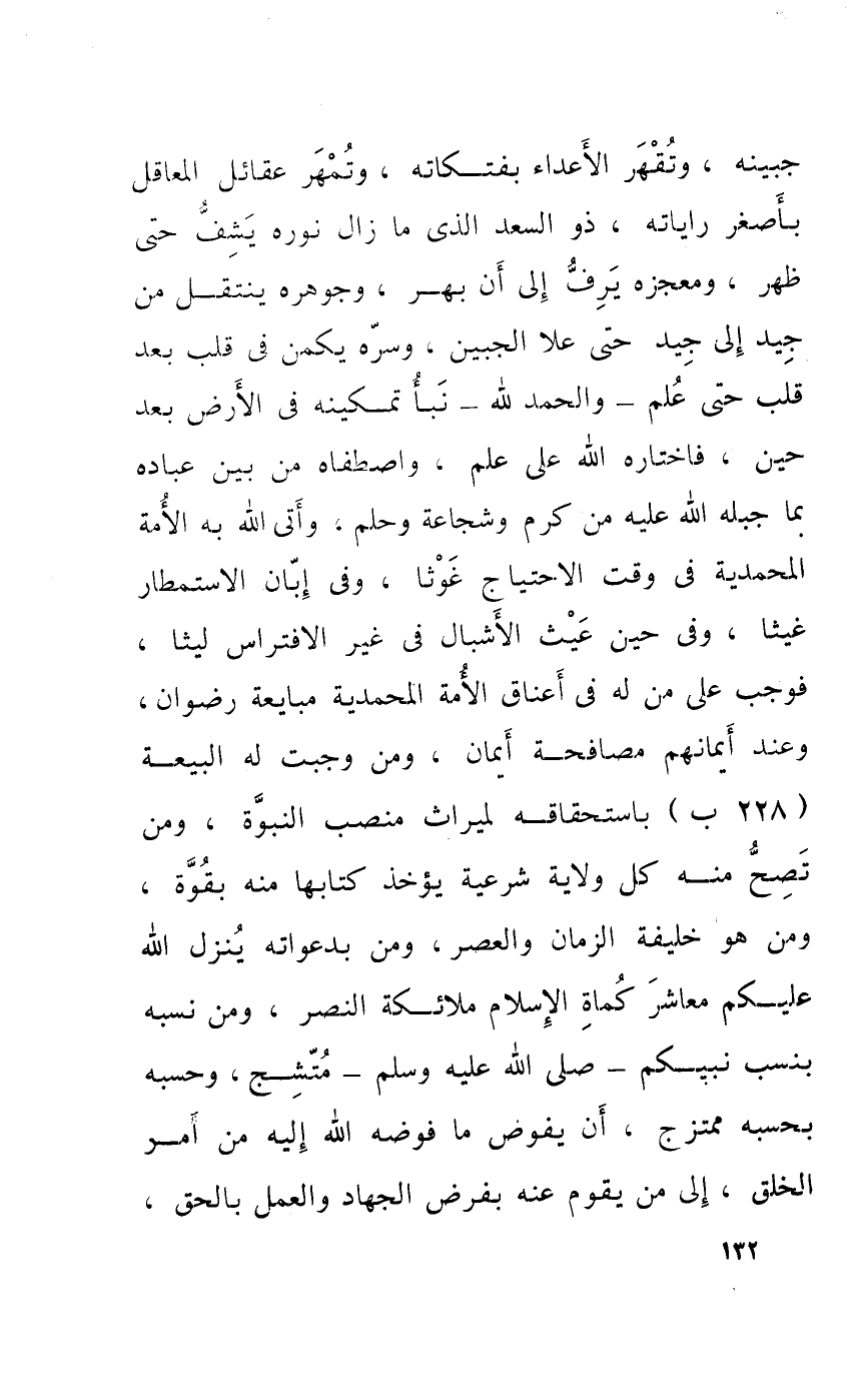 جَبينه وتقهر الْأَعْدَاء بفتكاته وتمهر عقائل المعاقل بأصغر راياته ذُو السعد الَّذِي مَا زَالَ نوره يشف حَتَّى ظهر ومعجزه يرف إِلَى أَن بهر وجوهره ينْتَقل من جيد إِلَى جيد حَتَّى علا الجبين وسره يكمن فِي قلب بعد قلب حَتَّى علم وَالْحَمْد لله نبأ تَمْكِينه فِي الأَرْض بعد حِين فاختاره الله على علم واصطفاه من بَين عباده بِمَا جبله الله عَلَيْهِ من كرم وشجاعة وحلم وأتى الله بِهِ الْأمة المحمدية فِي وَقت الِاحْتِيَاج غوثا وَفِي إبان الاستمطار غيثا وَفِي حِين عيث الأشبال فِي غير الافتراس ليثا فَوَجَبَ على من لَهُ فِي أَعْنَاق الْأمة المحمدية مبايعة رضوَان وَعند أَيْمَانهم مصافحة أَيْمَان وَمن وَجَبت لَهُ الْبيعَة باستحقاقه لميراث منصب النُّبُوَّة وَمن تصح مِنْهُ كل ولَايَة شَرْعِيَّة يُؤْخَذ كتابها مِنْهُ بِقُوَّة وَمن هُوَ خَليفَة الزَّمَان وَالْعصر وَمن بدعواته ينزل الله عَلَيْكُم معاشر كماة الْإِسْلَام مَلَائِكَة النَّصْر وَمن نسبه بِنسَب نَبِيكُم صلى الله عَلَيْهِ وَسلم متشج وحسبه بِحَسبِهِ ممتزج أَن يُفَوض مَا فوضه الله إِلَيْهِ من أَمر الْخلق إِلَى من يقوم عَنهُ بِفَرْض الْجِهَاد وَالْعَمَل بِالْحَقِّ