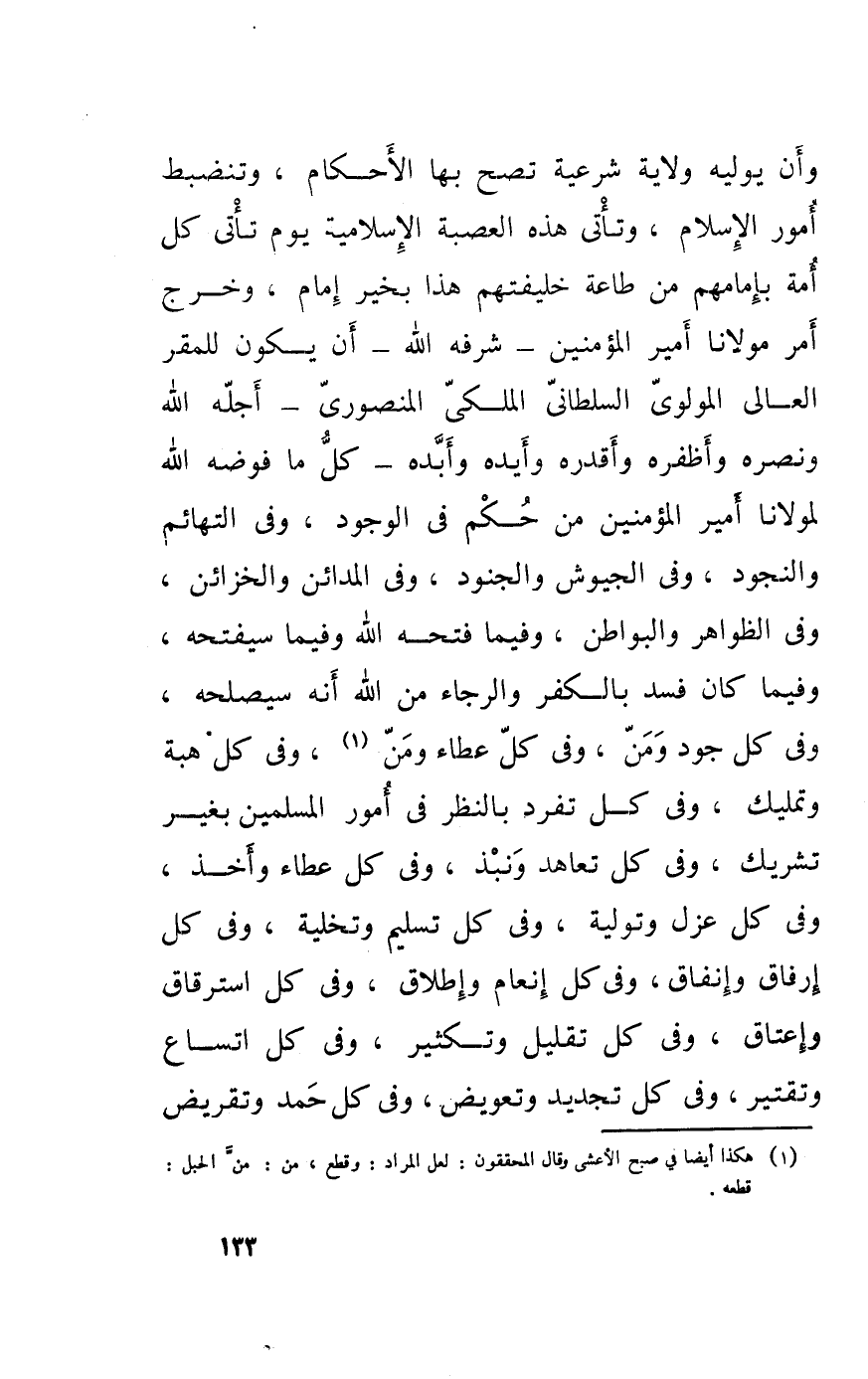وَأَن يوليه ولَايَة شَرْعِيَّة تصح بهَا الْأَحْكَام وتنضبط أُمُور الْإِسْلَام وَتَأْتِي هَذِه الْعصبَة الإسلامية يَوْم تَأتي كل أمة بإمامهم من طَاعَة خليفتهم هَذَا بِخَير إِمَام وَخرج أَمر مَوْلَانَا أَمِير الْمُؤمنِينَ شرفه الله أَن يكون للْمقر العالي المولوي السلطاني الملكي المنصوري أَجله الله وَنَصره وأظفره وأقدره وأيده وأبده كل مَا فوضه الله لمولانا أَمِير الْمُؤمنِينَ من حكم فِي الْوُجُود وَفِي التهائم والنجود وَفِي الجيوش والجنود وَفِي الْمَدَائِن والخزائن وَفِي الظَّوَاهِر والبواطن وَفِيمَا فَتحه الله وَفِيمَا سيفتحه وَفِيمَا كَانَ فسد بالْكفْر والرجاء من الله أَنه سيصلحه وَفِي كل جود وَمن وَفِي كل عَطاء وَمن وَفِي كل هبة وتمليك وَفِي كل تفرد بِالنّظرِ فِي أُمُور الْمُسلمين بِغَيْر تشريك وَفِي كل تعاهد ونبذ وَفِي كل عَطاء وَأخذ وَفِي كل عزل وتولية وَفِي كل تَسْلِيم وتخلية وَفِي كل إرفاق وإنفاق وَفِي كل إنعام وَإِطْلَاق وَفِي كل استرقاق وإعتاق وَفِي كل تقليل وتكثير وَفِي كل اتساع وتقتير وَفِي كل تَجْدِيد وتعويض وَفِي كل حمد وتقريض