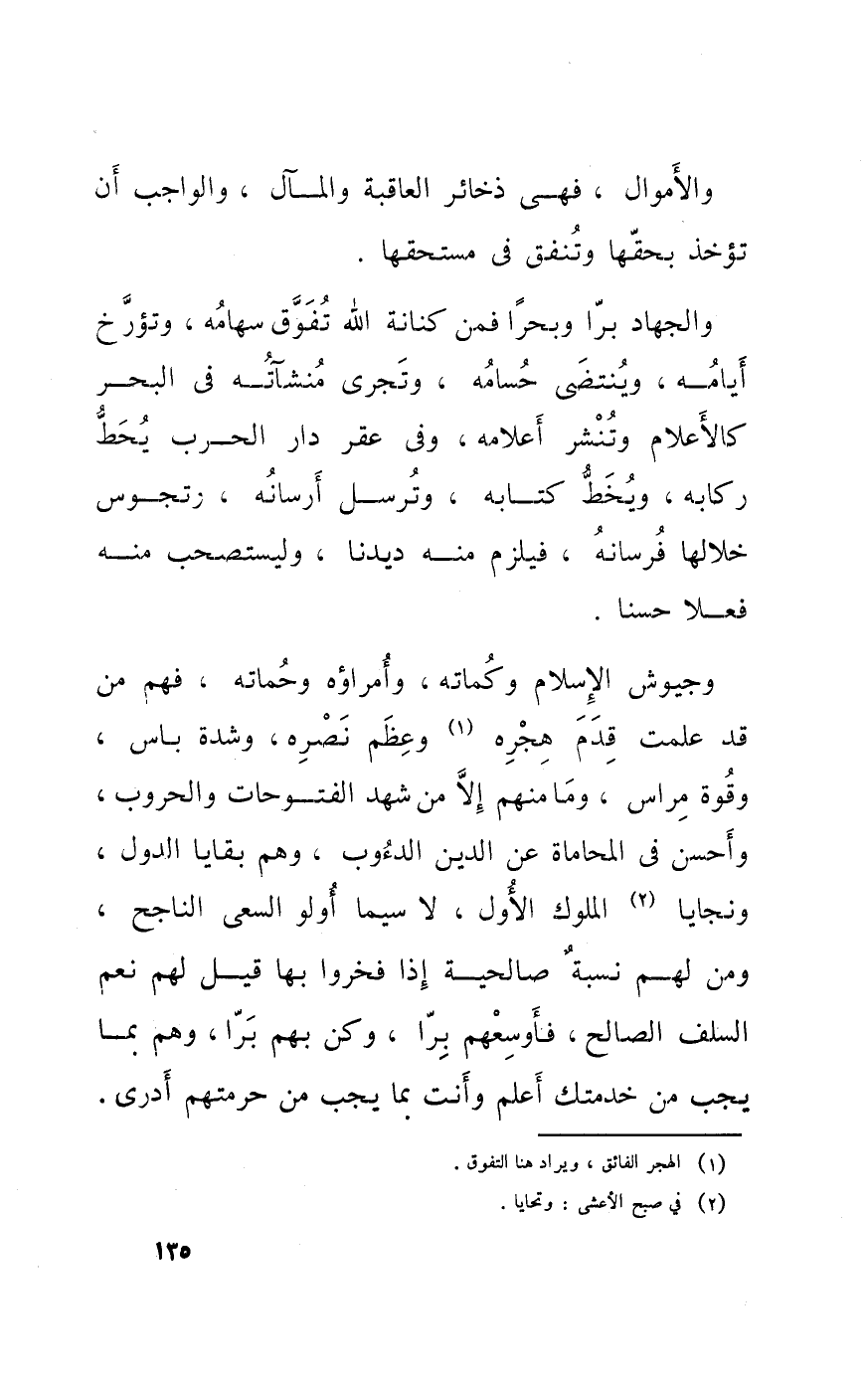 وجيوش الْإِسْلَام وكماته وأمراؤه وحماته فهم من قد علمت قدم هجره وَعظم نَصره وَشدَّة بَأْس وَقُوَّة مراس وَمَا مِنْهُم إِلَّا من شهد الفتوحات والحروب وَأحسن فِي المحاماة عَن الدّين الدءوب وهم بقايا الدول ونجايا الْمُلُوك الأول لَا سِيمَا أولو السَّعْي الناجح وَمن لَهُم نِسْبَة صالحية إِذا فَخَروا بهَا قيل لَهُم نعم السّلف الصَّالح فأوسعهم برا وَكن بهم برا وهم بِمَا يجب من خدمتك أعلم وَأَنت بِمَا يجب من حرمتهم أدرى