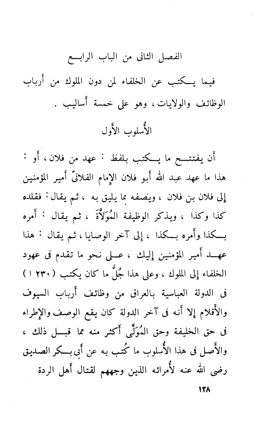 أَن يفْتَتح مَا بكتب بِلَفْظ عهد من فلَان أَو هَذَا مَا عهد عبد الله أَبُو فلَان الإِمَام الْفُلَانِيّ أَمِير الْمُؤمنِينَ إِلَى فلَان بن فلَان ويصفه بِمَا يَلِيق بِهِ ثمَّ يُقَال فقلده كَذَا وَكَذَا وَيذكر الْوَظِيفَة المولاة ثمَّ يُقَال أمره بِكَذَا وَأمره بِكَذَا إِلَى آخر الوصابا ثمَّ يُقَال هَذَا عهد أَمِير الْمُؤمنِينَ إِلَيْك على نَحْو مَا تقدم فِي عهود الْخُلَفَاء إِلَى الْمُلُوك وعَلى هَذَا جلّ مَا كَانَ يكْتب فِي الدولة العباسية بالعراق من وظائف أَرْبَاب السيوف والأقلام إِلَّا أَنه فِي آخر الدولة كَانَ يَقع الْوَصْف والإطراء فِي حق الْخَلِيفَة وَحقّ الْمولى أَكثر مِنْهُ مِمَّا قبل ذَلِك وَالْأَصْل فِي هَذَا الأسلوب مَا كتب بِهِ عَن أبي بكر الصّديق رَضِي الله عَنهُ لأمرائه الَّذين وجههم لقِتَال أهل الرِّدَّة