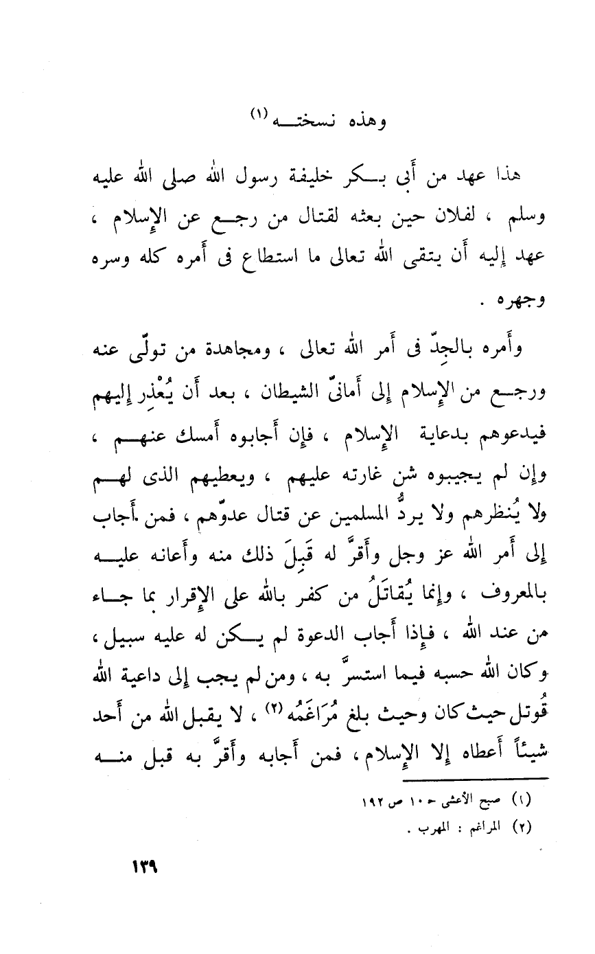 هَذَا عهد من أبي بكر خَليفَة رَسُول الله صلى الله عَلَيْهِ وَسلم لفُلَان حِين بَعثه لقِتَال من رَجَعَ عَن الْإِسْلَام عهد إِلَيْهِ أَن يتقى الله تَعَالَى مَا اسْتَطَاعَ فِي أمره كُله وسره وجهره