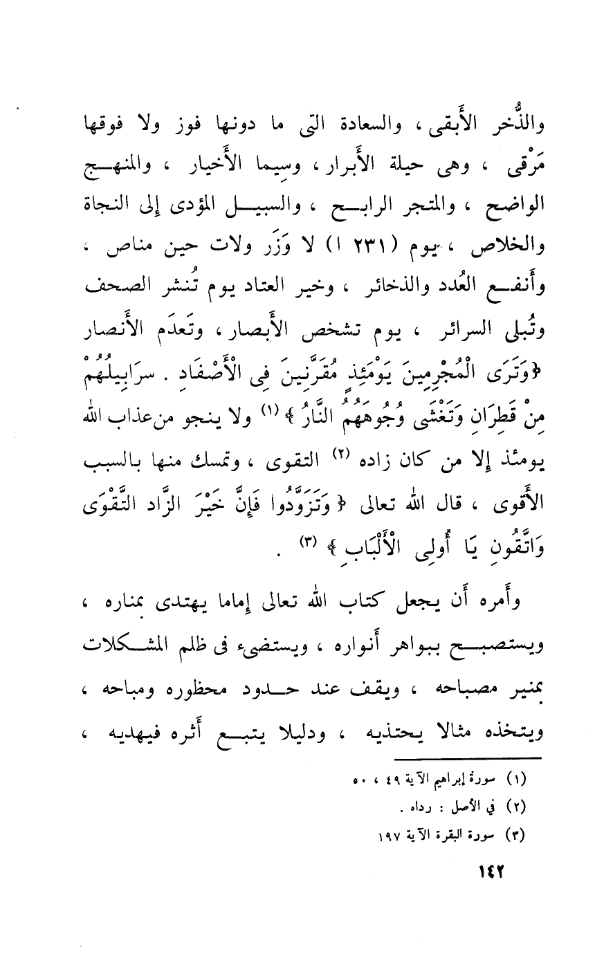 والذخر الأبقى والسعادة الَّتِي مَا دونهَا فوز وَلَا فَوْقهَا مرقى وَهِي حِيلَة الْأَبْرَار وسيما الأخيار والمنهج الْوَاضِح والمتجر الرابح والسبيل الْمُؤَدِّي إِلَى النجَاة والخلاص يَوْم لَا وزر ولات حِين مناص وأنفع الْعدَد والذخائر وَخير العتاد يَوْم تنشر الصُّحُف وتبلى السرائر يَوْم تشخص الْأَبْصَار وتعدم الْأَنْصَار {وَترى الْمُجْرمين يَوْمئِذٍ مُقرنين فِي الأصفاد سرابيلهم من قطران وتغشى وُجُوههم النَّار} وَلَا ينجو من عَذَاب الله يَوْمئِذٍ إِلَّا من كَانَ زَاده التَّقْوَى وَتمسك مِنْهَا بِالسَّبَبِ الْأَقْوَى قَالَ الله تَعَالَى {وتزودوا فَإِن خير الزَّاد التَّقْوَى واتقون يَا أولي الْأَلْبَاب}