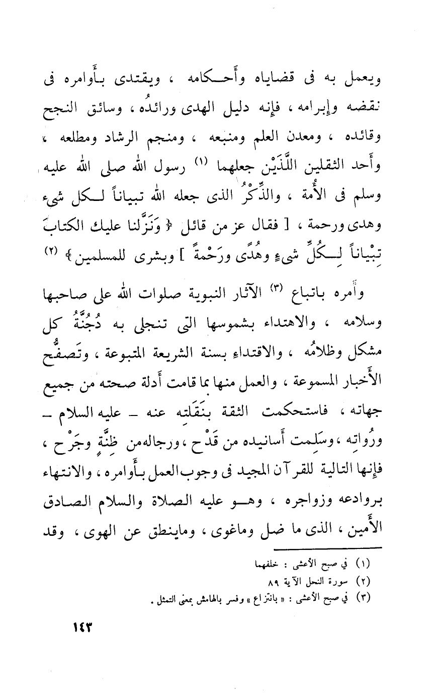 وَأمره بِاتِّبَاع الْآثَار النَّبَوِيَّة صلوَات الله على صَاحبهَا وَسَلَامه والاهتداء بشموسها الَّتِي تنجلي بِهِ دجنة كل مُشكل وظلامه والاقتداء بِسنة الشَّرِيعَة المتبوعة وتصفح الْأَخْبَار المسموعة وَالْعَمَل مِنْهَا بِمَا قَامَت أَدِلَّة صِحَّته من جَمِيع جهاته فاستحكمت الثِّقَة بنقلته عَنهُ عَلَيْهِ السَّلَام وَرُوَاته وسلمت أسانيده من قدح وَرِجَاله من ظنة وجرح فَإِنَّهَا التالية لِلْقُرْآنِ الْمجِيد فِي وجوب الْعَمَل بأوامره والانتهاء بروادعه وزواجره وَهُوَ عَلَيْهِ الصَّلَاة وَالسَّلَام الصَّادِق الْأمين الَّذِي مَا ضل وَمَا غوى وَمَا ينْطق عَن الْهوى وَقد