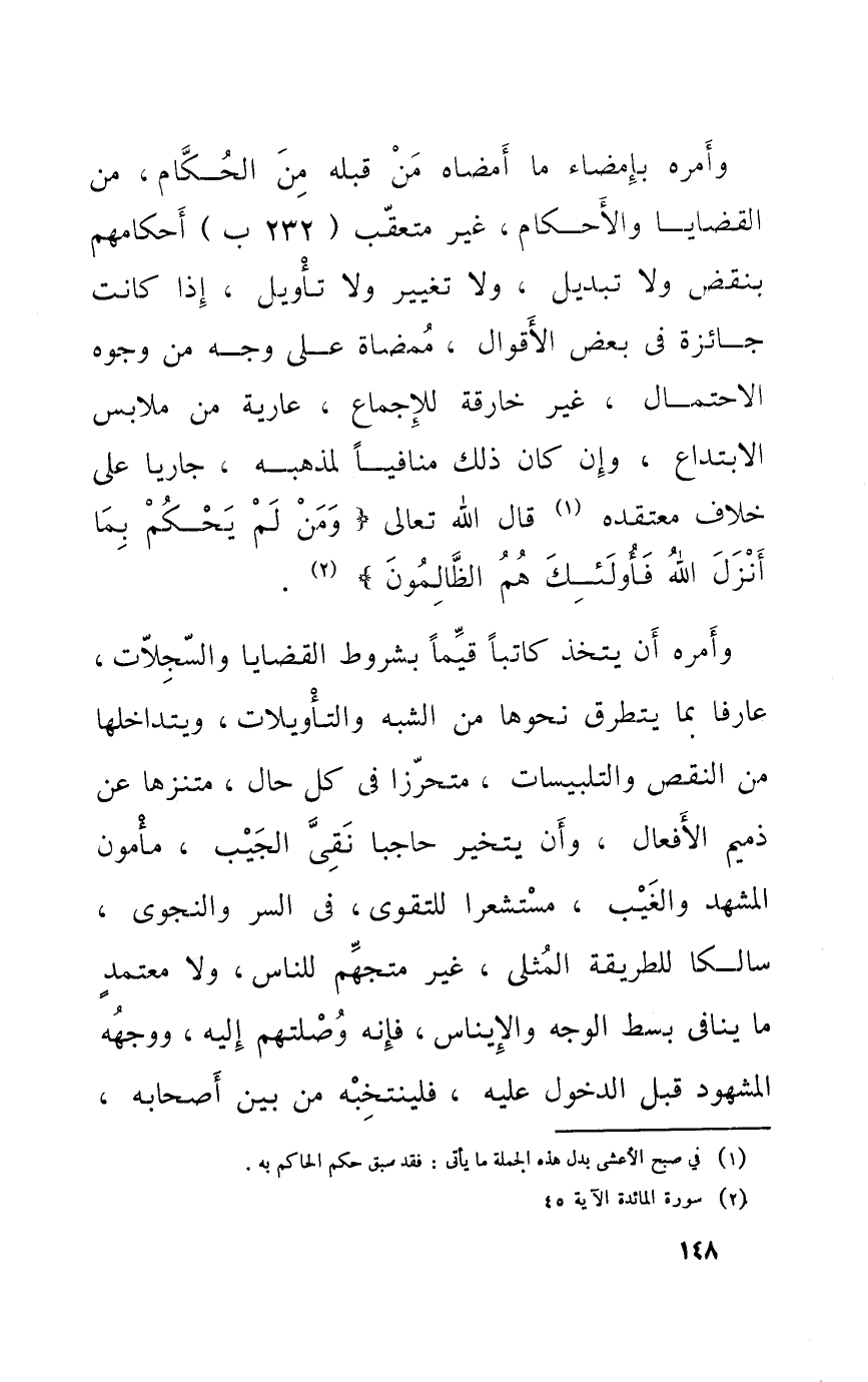 وَأمره بإمضاء مَا أَمْضَاهُ من قبله من الْحُكَّام من القضايا وَالْأَحْكَام غير متعقب أحكامهم بِنَقْض وَلَا تَبْدِيل وَلَا تَغْيِير وَلَا تَأْوِيل إِذا كَانَت جَائِزَة فِي بعض الْأَقْوَال ممضاة على وَجه من وُجُوه الِاحْتِمَال غير خارقة للْإِجْمَاع عَارِية من ملابس الابتداع وَإِن كَانَ ذَلِك منافيا لمذهبه جَارِيا على خلاف معتقده قَالَ الله تَعَالَى {وَمن لم يحكم بِمَا أنزل الله فَأُولَئِك هم الظَّالِمُونَ}