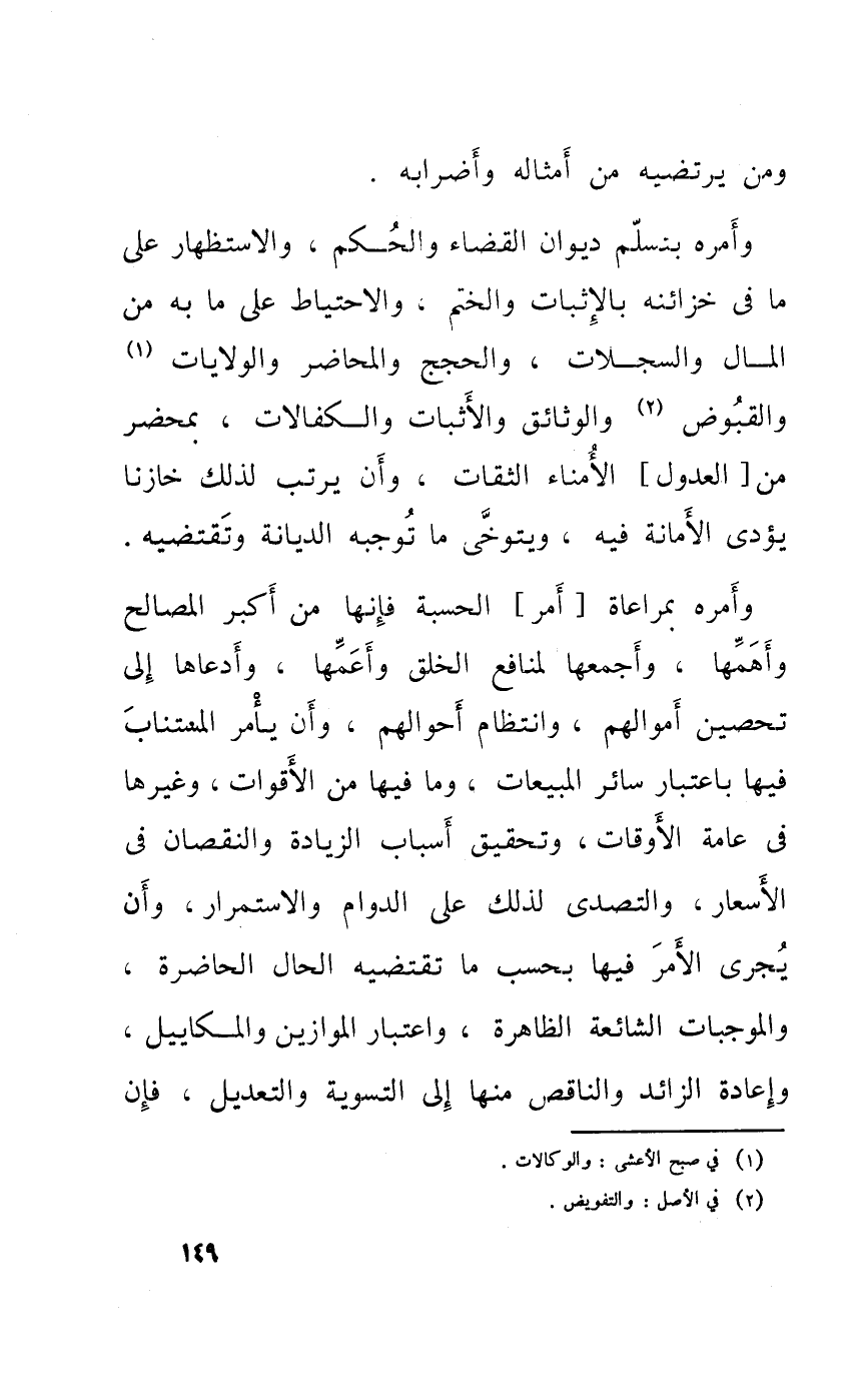 وَأمره بمراعاة أَمر الْحِسْبَة فَإِنَّهَا من أكبر الْمصَالح وأهمها وأجمعها لمنافع الْخلق وأعمها وأدعاها إِلَى تحصين أَمْوَالهم وانتظام أَحْوَالهم وَأَن يَأْمر المستناب فِيهَا بِاعْتِبَار سَائِر المبيعات وَمَا فِيهَا من الأقوات وَغَيرهَا فِي عَامَّة الْأَوْقَات وَتَحْقِيق أَسبَاب الزِّيَادَة وَالنُّقْصَان فِي الأسعار والتصدي لذَلِك على الدَّوَام والاستمرار وَأَن يجْرِي الْأَمر فِيهَا بِحَسب مَا تَقْتَضِيه الْحَال الْحَاضِرَة وَالْمُوجِبَات الشائعة الظَّاهِرَة وَاعْتِبَار الموازين والمكاييل وإعادة الزَّائِد والناقص مِنْهَا إِلَى التَّسْوِيَة وَالتَّعْدِيل فَإِن