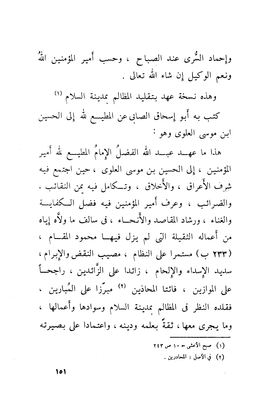 هَذَا مَا عهد عبد الله الْفضل الإِمَام الْمُطِيع لله ذأمير الْمُؤمنِينَ إِلَى الْحُسَيْن بن مُوسَى الْعلوِي حِين اجْتمع فِيهِ شرف الأعراق والأخلاق وتكامل فِيهِ يمن النقائب والضرائب وَعرف أَمِير الْمُؤمنِينَ فِيهِ فضل الْكِفَايَة والغناء ورشاد الْمَقَاصِد والأنحاء فِي سالف مَا ولاه إِيَّاه من أَعماله الثَّقِيلَة الَّتِي لم يزل فِيهَا مَحْمُود الْمقَام مستمرا على النظام مُصِيب النَّقْض والإبرام سديد الإسداء والإلحام زَائِدا على الزائدين راجحا على الموازين فائتا المحاذين مبرزا على المبارين فقلده النّظر فِي الْمَظَالِم بِمَدِينَة السَّلَام وسوادها وأعمالها وَمَا يجْرِي مَعهَا ثِقَة بِعِلْمِهِ وَدينه واعتمادا على بصيرته