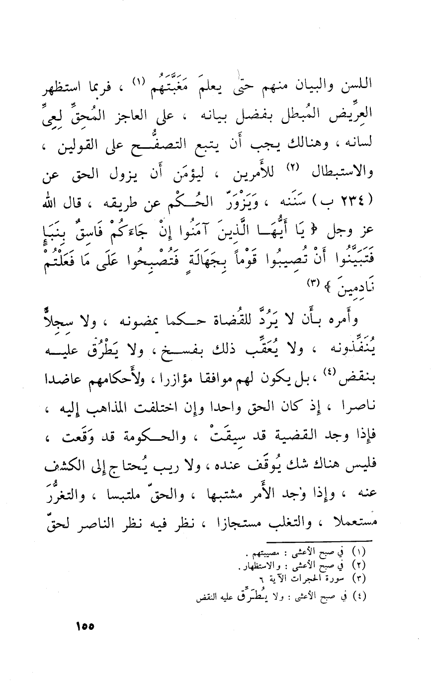 اللسن وَالْبَيَان مِنْهُم حَتَّى يعلم مغبتهم فَرُبمَا استظهر العريض الْمُبْطل بِفضل بَيَانه على الْعَاجِز المحق لعي لِسَانه وهنالك يجب أَن يتبع التصفح على الْقَوْلَيْنِ والاستبطال للأمرين ليؤمن أَن يَزُول الْحق عَن سنَنه ويزور الحكم عَن طَرِيقه قَالَ الله عز وَجل {يَا أَيهَا الَّذين آمنُوا إِن جَاءَكُم فَاسق بِنَبَأٍ فَتَبَيَّنُوا أَن تصيبوا قوما بِجَهَالَة فتصبحوا على مَا فَعلْتُمْ نادمين}
