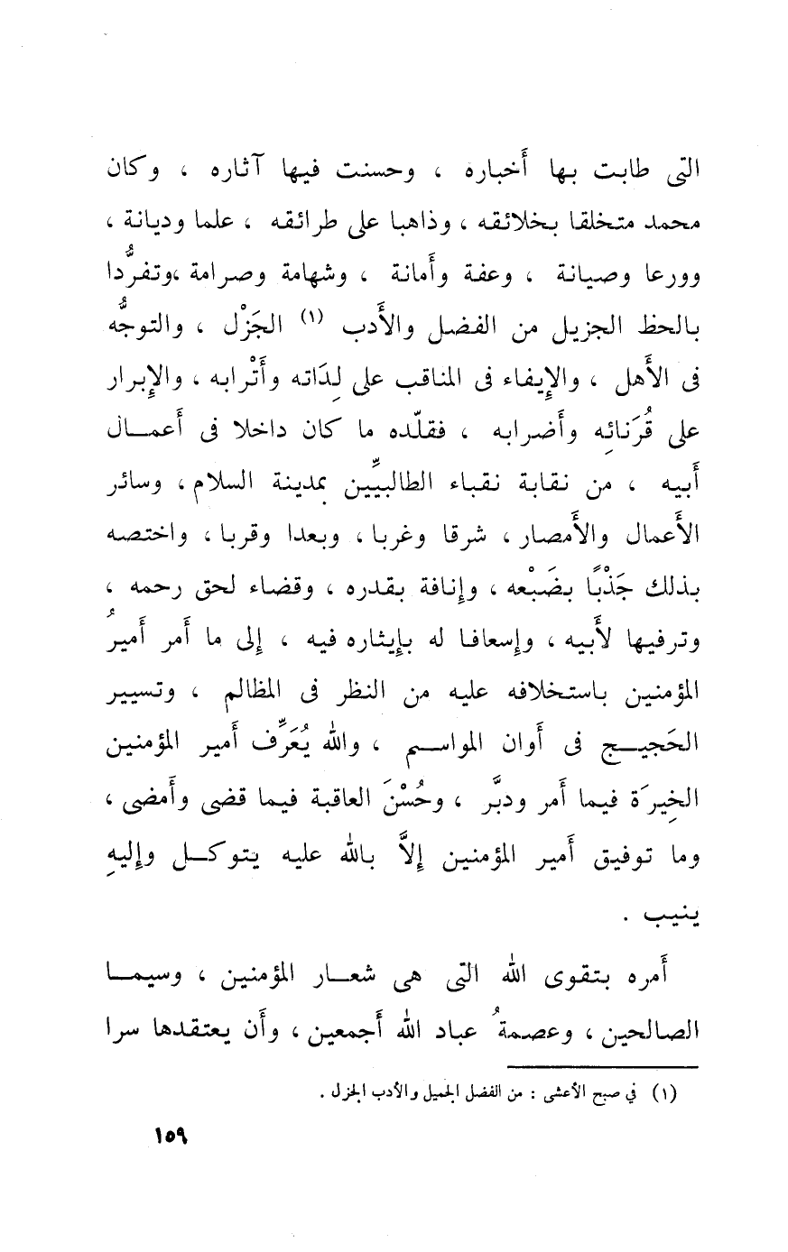 الَّتِي طابت بهَا أخباره وَحسنت فِيهَا آثاره وَكَانَ مُحَمَّد متخلقا بخلائقه ذَاهِبًا على طرائقه علما وديانة وورعا وصيانة وعفة وَأَمَانَة وشهامة وصرامة وتفردا بالحظ الجزيل من الْفضل وَالْأَدب الجزل والتوجه فِي الْأَهْل والإيفاء فِي الناتب على لداته وأترابه والإبرار على قرنائه وَأَضْرَابه فقلده مَا كَانَ دَاخِلا فِي أَعمال أَبِيه من نقابة نقباء الطالبيين بِمَدِينَة السَّلَام وَسَائِر الْأَعْمَال والأمصار شرقا وغربا وبعدا وقربا واختصه بذلك جذبا بضبعه وإنافة بِقَدرِهِ وَقَضَاء لحق رَحمَه وترفيها لِأَبِيهِ وإسعافا لَهُ بإيثاره فِيهِ إِلَى مَا أَمر أَمِير الْمُؤمنِينَ باسخلافه عَلَيْهِ من النّظر فِي الْمَظَالِم وتسيير الحجيج فِي أَوَان المواسم وَالله يعرف أَمِير الْمُؤمنِينَ الْخيرَة فِيمَا أَمر ودبر وَحسن الْعَاقِبَة فِيمَا قضى وأمضى وَمَا توفيق أَمِير الْمُؤمنِينَ إِلَّا بِاللَّه عَلَيْهِ يتوكل وَإِلَيْهِ ينيب