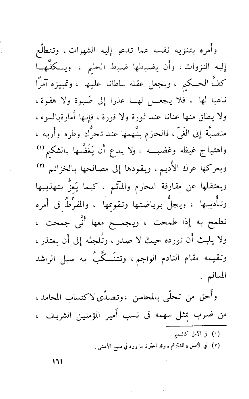 وَأمره بتنزيه نَفسه عَمَّا تَدْعُو إِلَيْهِ الشَّهَوَات وتتطلع إِلَيْهِ النزوات وَأَن يضبطها ضبط الْحَلِيم ويكفها كف الْحَكِيم وَيجْعَل عقله سُلْطَانا عَلَيْهَا وتمييزه آمرا ناهيا لَهَا فَلَا يَجْعَل لَهَا عذرا إِلَى صبوة وَلَا هفوة وَلَا يُطلق مِنْهَا عنانا عِنْد ثورة وَلَا فورة فَإِنَّهَا أَمارَة بالسوء منصبة إِلَى الغي فالحازم يتهمها عِنْد تحرّك وطره وأربه واهتياج غيظه وغضبه وَلَا يدع أَن يغضها بالشكيم ويعركها عَرك الْأَدِيم ويقودها إِلَى مصالحها بالخزائم ويعتقلها عَن مقارفة الْمَحَارِم والمآثم كَيْمَا يعز بتهذيبها وتأديبها ويجل برياضتها وتقويمها والمفرط فِي أمره تطمح بِهِ إِذا طمحت ويجمح مَعهَا أَنى جمحت وَلَا يلبث أَن تورده حَيْثُ لَا صدر وتلجئه إِلَى أَن يعْتَذر وتقيمه مقَام النادم الواجم وتتنكب بِهِ سبل الراشد المسالم