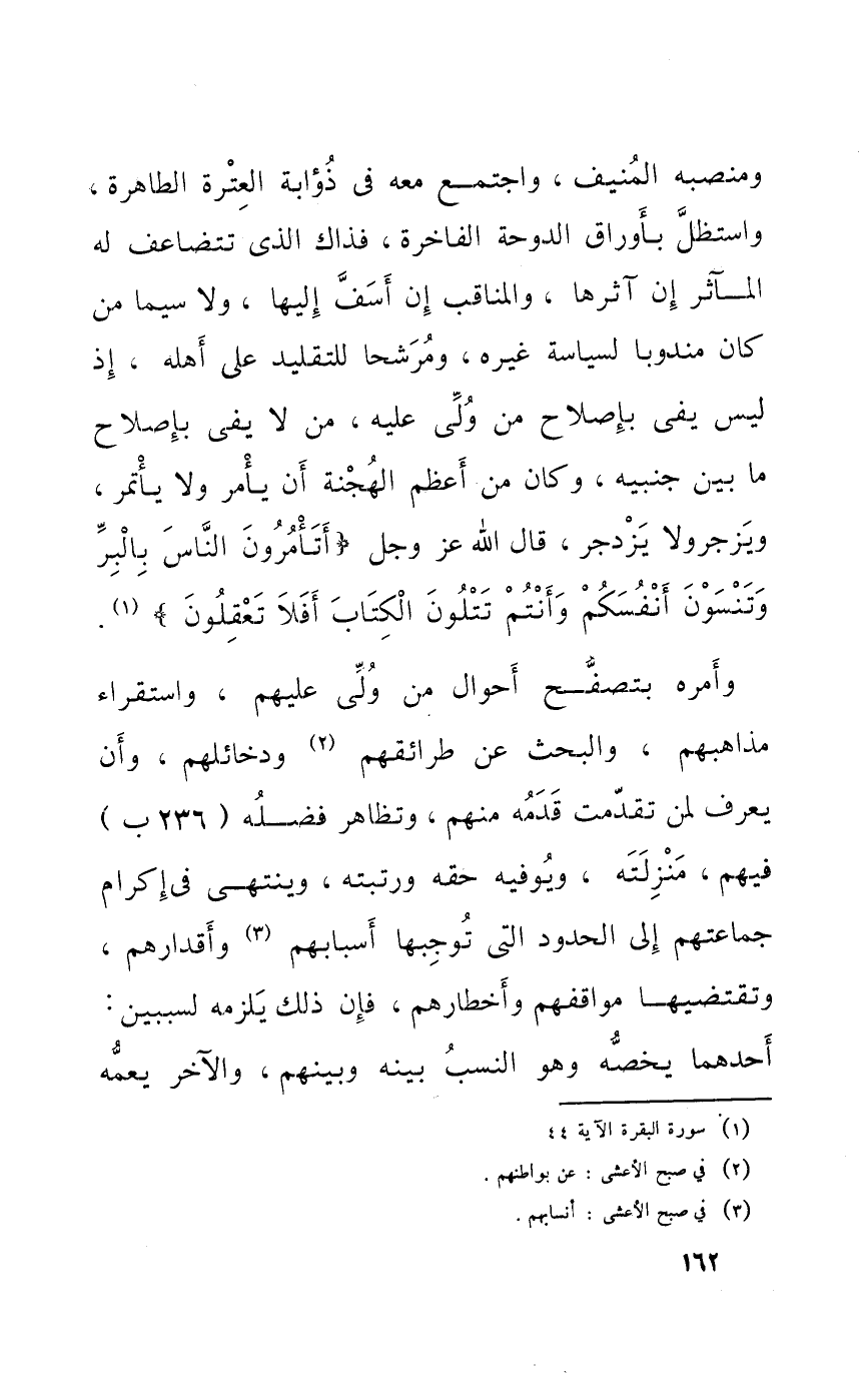 ومنصبه المنيف وَاجْتمعَ مَعَه فِي ذؤابة العترة الطاهرة واستظل بأوراق الدوحة الفاخرة فَذَاك الَّذِي تتضاعف لَهُ المآثر إِن آثرها والمناقب إِن أَسف إِلَيْهَا وَلَا سِيمَا من كَانَ مَنْدُوبًا لسياسة غَيره ومرشحا للتقليد على أَهله إِذْ لَيْسَ يَفِي بإصلاح من ولى عَلَيْهِ من لَا يَفِي بإصلاح مَا بَين جَنْبَيْهِ وَكَانَ من أعظم الهجنة أَن يَأْمر وَلَا يأتمر ويزجر وَلَا يزدجر قَالَ الله عز وَجل {أتأمرون النَّاس بِالْبرِّ وتنسون أَنفسكُم وَأَنْتُم تتلون الْكتاب أَفلا تعقلون}