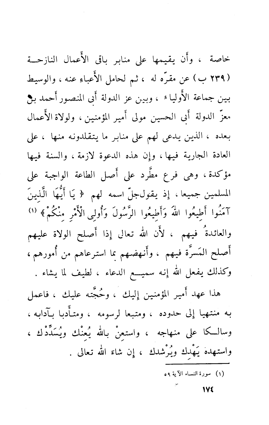 خَاصَّة وَأَن يقيمها على مَنَابِر بَاقِي الْأَعْمَال النازحة عَن مقره لَهُ ثمَّ لحامل الأعباء عَنهُ والوسيط بَين جمَاعَة الْأَوْلِيَاء وَبَين عز الدولة أبي الْمَنْصُور أَحْمد بن معز الدولة أبي الْحُسَيْن مولى أَمِير الْمُؤمنِينَ ولولاة الْأَعْمَال بعده الَّذين يدعى لَهُم على مَنَابِر مَا يتقلدونه مِنْهَا على الْعَادة الْجَارِيَة فِيهَا وَإِن هَذِه الدعْوَة لَازِمَة وَالسّنة فِيهَا مُؤَكدَة وَهِي فرع مطرد على أصل الطَّاعَة الْوَاجِبَة على الْمُسلمين جَمِيعًا إِذْ يَقُول جلّ اسْمه لَهُم {يَا أَيهَا الَّذين آمنُوا أطِيعُوا الله وَأَطيعُوا الرَّسُول وأولي الْأَمر مِنْكُم} والعائدة فيهم لِأَن الله تَعَالَى إِذا أصلح الْوُلَاة عَلَيْهِم أصلح المسرة فيهم وأنهضهم بِمَا استرعاهم من أُمُورهم وَكَذَلِكَ يفعل الله إِنَّه سميع الدُّعَاء لطيف لما يَشَاء