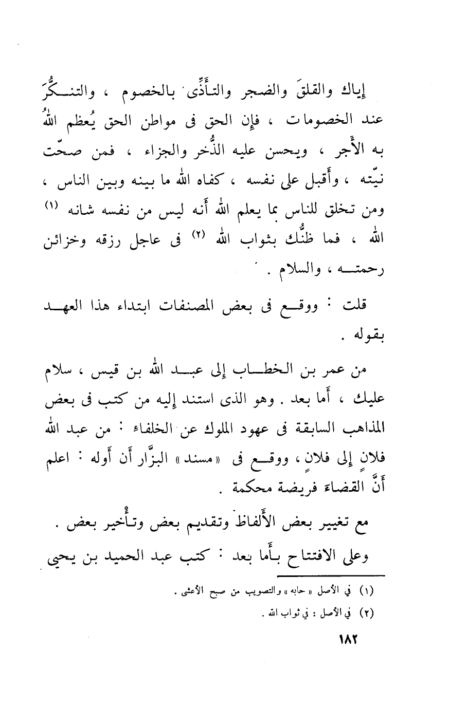 من عمر بن الْخطاب إِلَى عبد الله بن قيس سَلام عَلَيْك أما بعد وَهُوَ الَّذِي اسْتندَ إِلَيْهِ من كتب من بعض الْمذَاهب السَّابِقَة فِي عهود الْمُلُوك عَن الْخُلَفَاء من عبد الله فلَان إِلَى فلَان وَوَقع فِي مُسْند الْبَزَّار أَن أَوله اعْلَم أَن الْقَضَاء فَرِيضَة محكمَة