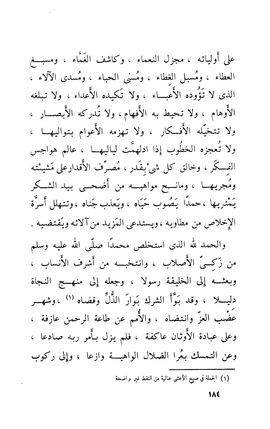 وَالْحَمْد لله الَّذِي استخلص مُحَمَّدًا صلى الله عَلَيْهِ وَسلم من زكي الأصلاب وانتخبه من أشرف الْأَنْسَاب وَبَعثه إِلَى الخليقة رَسُولا وَجعله إِلَى مَنْهَج النجَاة دَلِيلا وَقد بوأ الشّرك بوار الذل وقضاه وَشهر عضب الْعِزّ وانتضاه والأمم عَن طَاعَة الرَّحْمَن عازفة وعَلى عبَادَة الْأَوْثَان عاكفة فَلم يزل بِأَمْر ربه صادعا وَعَن التَّمَسُّك بعرا الضلال الْوَاهِيَة وازعا وَإِلَى ركُوب