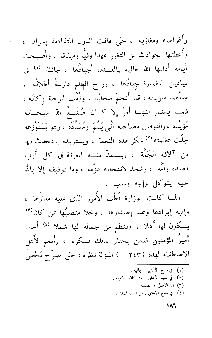 وأغراضه ومغازيه حَتَّى فاقت الدول المتقادمة إشراقا وأعطتها الْحَوَادِث من التَّغَيُّر عهدا وفيا وميثاقا وأصبحت أَيَّامه أدامها الله حَالية بِالْعَدْلِ أجيادها جائلة فِي ميادين النضارة جيادها وَرَاح الظُّلم دارسة أطلاله مقلصا سرباله قد انجم سحابه وزمت للرحلة ركابه فَمَا يسْتَمر مِنْهَا أَمر إِلَّا كَانَ صنع الله سُبْحَانَهُ مؤيده والتوفيق مصاحبه أَنى يمم ومسدده وَهُوَ يستوزعه جلت عَظمته شكر هَذِه النِّعْمَة ويستزيده بالتحدث بهَا من آلائه الجمة ويستمد مِنْهُ المعونة فِي كل أرب قَصده وَأمه وشحذ لانتحائه عزمه وَمَا توفيقه إِلَّا بِاللَّه عَلَيْهِ يتوكل وَإِلَيْهِ ينيب