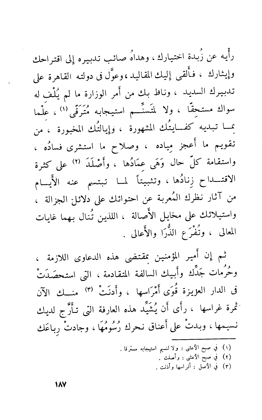 رَأْيه عَن زبدة اختيارك وهداه صائب تَدْبيره إِلَى اقتراحك وإيثارك فَألْقى إِلَيْك المقاليد وعول فِي دولته الْقَاهِرَة على تدبيرك السديد وناط بك من أَمر الوزارة مَا لم يلف لَهُ سواك مُسْتَحقّا وَلَا لمتسنم استيجابه مترقى علما بِمَا تبديه كفايتك الْمَشْهُورَة وإيالتك المخبورة من تَقْوِيم مَا أعجز مياده وَصَلَاح مَا استشرى فَسَاده واستقامة كل حَال وَهِي عمادها وأصلد على كَثْرَة الاقتداح زنادها وتثبيتا لما تبتسم عَنهُ الْأَيَّام من آثَار نظرك المعربة عَن احتوائك على دَلَائِل الجزالة واستيلائك على مخايل الْأَصَالَة اللَّذين تنَال بهما غايات الْمَعَالِي وتفرع الذرا والأعالي
