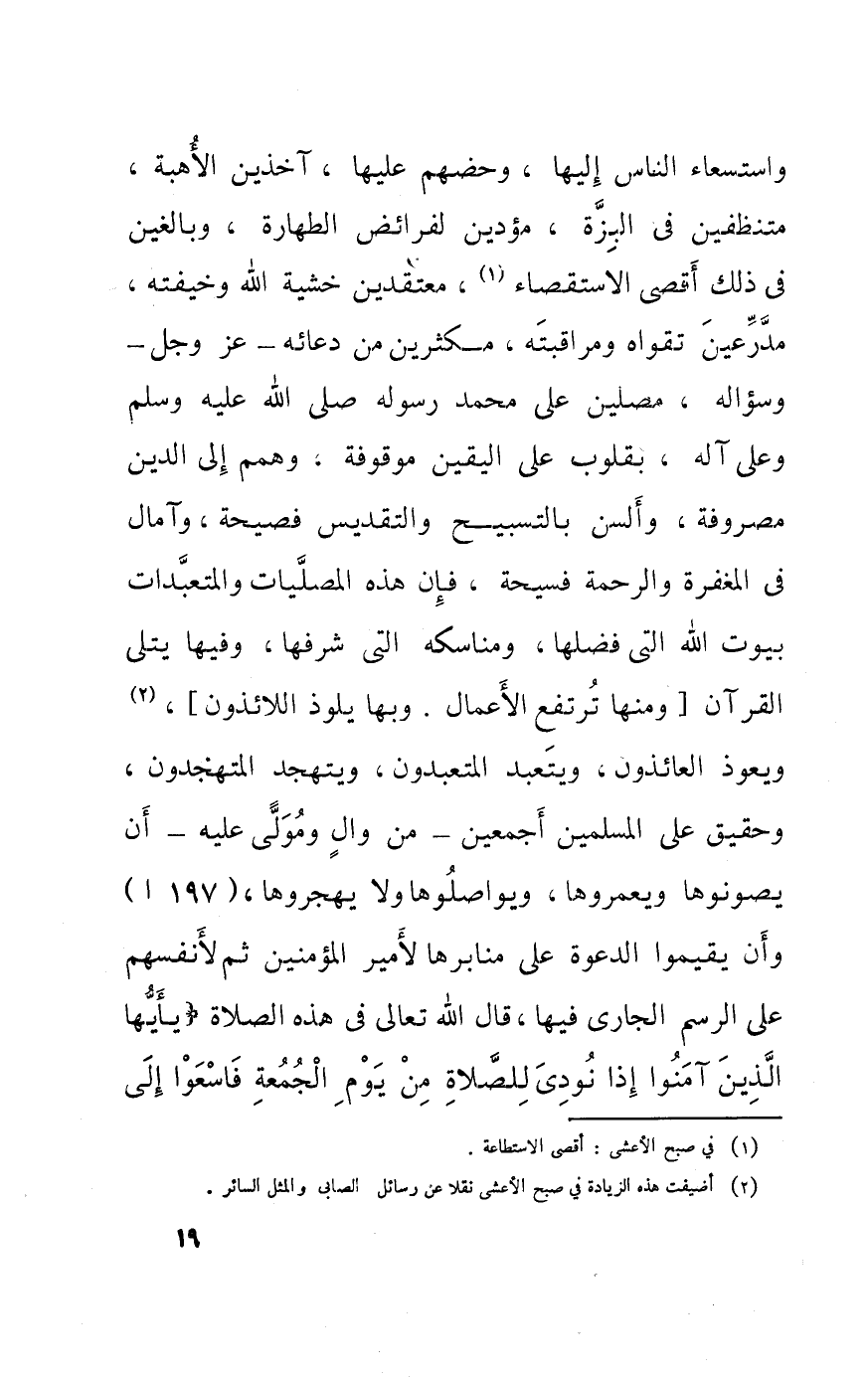 واستسعاء النَّاس إِلَيْهَا وحضهم عَلَيْهَا آخذين الأهبة متنظفين فِي البزة مؤدين لفرائض الطَّهَارَة وبالغين فِي ذَلِك أقْصَى الإستقصاء معتقدين خشيَة الله وخيفته مدرعين تقواه ومراقبته مكثرين من دُعَائِهِ عز وَجل وسؤاله مصلين على مُحَمَّد رَسُوله صلى الله عَلَيْهِ وَسلم وعَلى آله بقلوب على الْيَقِين مَوْقُوفَة وهمم إِلَى الدّين مصروفة وألسن بالتسبيح وَالتَّقْدِيس فصيحة وآمال فِي الْمَغْفِرَة وَالرَّحْمَة فسيحة فَإِن هَذِه الْمُصَليَات والمتعبدات بيُوت الله الَّتِي فَضلهَا ومناسكه الَّتِي شرفها وفيهَا يُتْلَى الْقُرْآن وَمِنْهَا ترْتَفع الْأَعْمَال وَبهَا يلوذ اللائذون ويعوذ العائذون ويتعبد المتعبدون ويتهجد المتهجدون وحقيق على الْمُسلمين أَجْمَعِينَ من وَال وَمولى عَلَيْهِ أَن يصونوها ويعمروها ويواصلوها وَلَا يهجروها 197 اوأن يقيموا الدعْوَة على منابرها لأمير الْمُؤمنِينَ ثمَّ لأَنْفُسِهِمْ على الرَّسْم الْجَارِي فِيهَا قَالَ الله تَعَالَى فِي هَذِه الصَّلَاة {يَا أَيهَا الَّذين آمنُوا إِذا نُودي للصَّلَاة من يَوْم الْجُمُعَة فَاسْعَوْا إِلَى ذكر الله وذروا البيع}