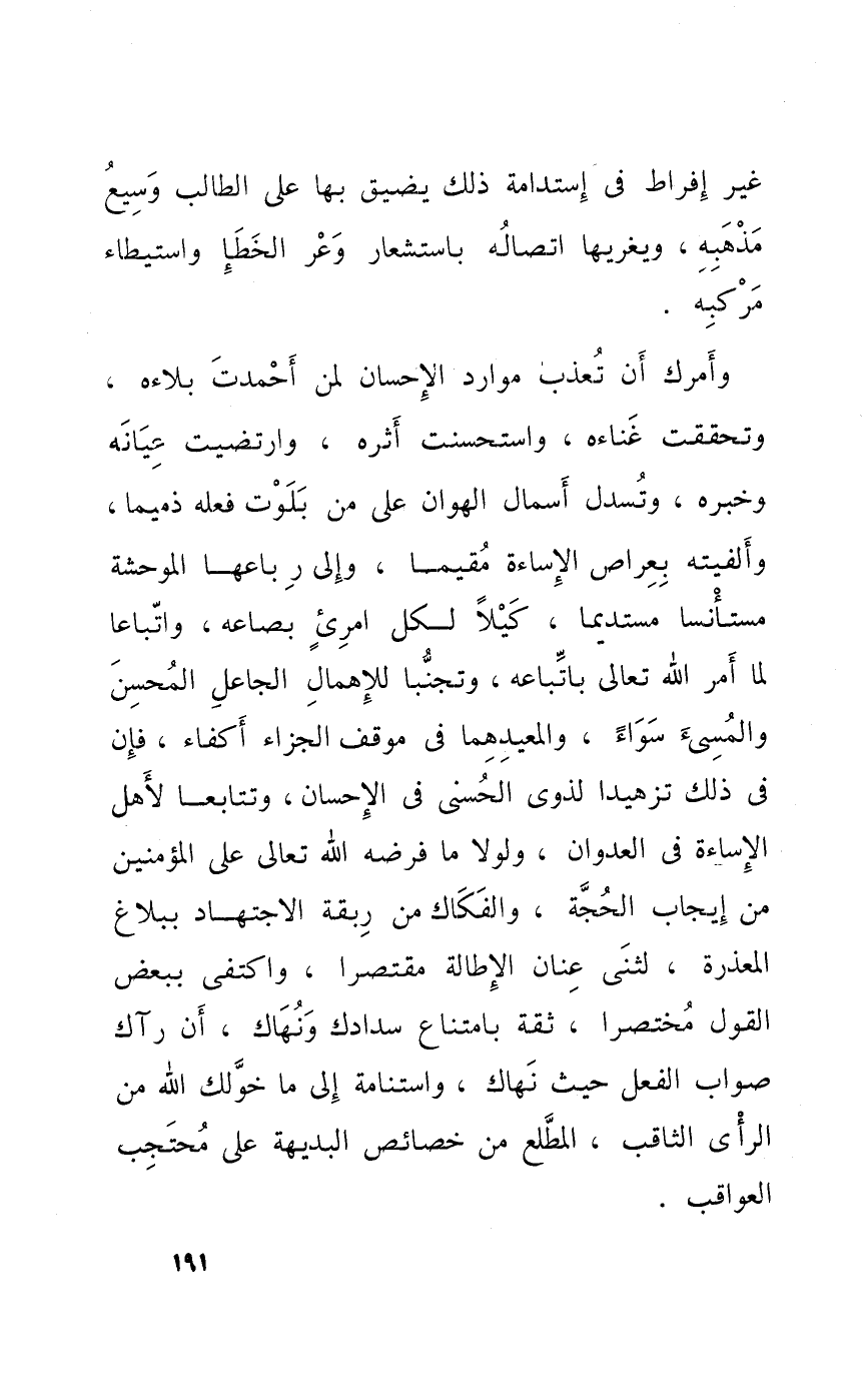 وأمرك أَن تعذب موارد الْإِحْسَان لمن أحمدت بلاءه وتحققت غناءه واستحسنت أَثَره وارتضيت عيانه وَخَبره وتسدل أسمال الهوان على من بلوت فعله ذَمِيمًا وألفيته بعراص الْإِسَاءَة مُقيما وَإِلَى رباعها الموحشة مستأنسا مستديما كَيْلا لكل امْرِئ بصاعه واتباعا لما أَمر الله تَعَالَى باتباعه وتجنبا للإهمال الْجَاعِل المحسن والمسئ سَوَاء والمعيدهما فِي موقف الْجَزَاء أكفاء فَإِن فِي ذَلِك تزهيدا لِذَوي الْحسنى فِي الْإِحْسَان وتتابعا لأهل الْإِسَاءَة فِي الْعدوان وَلَوْلَا مَا فَرْضه الله تَعَالَى على الْمُؤمنِينَ من إِيجَاب الْحجَّة والفكاك من ربقة الِاجْتِهَاد ببلاغ المعذرة لثنى عنان الإطالة مُقْتَصرا وَاكْتفى بِبَعْض القَوْل مُخْتَصرا ثِقَة بامتناع سدادك ونهاك أَن رآك صَوَاب الْفِعْل حَيْثُ نهاك واستنامة إِلَى مَا خولك الله من الرَّأْي الثاقب المطلع من خَصَائِص البديهة على محتجب العواقب