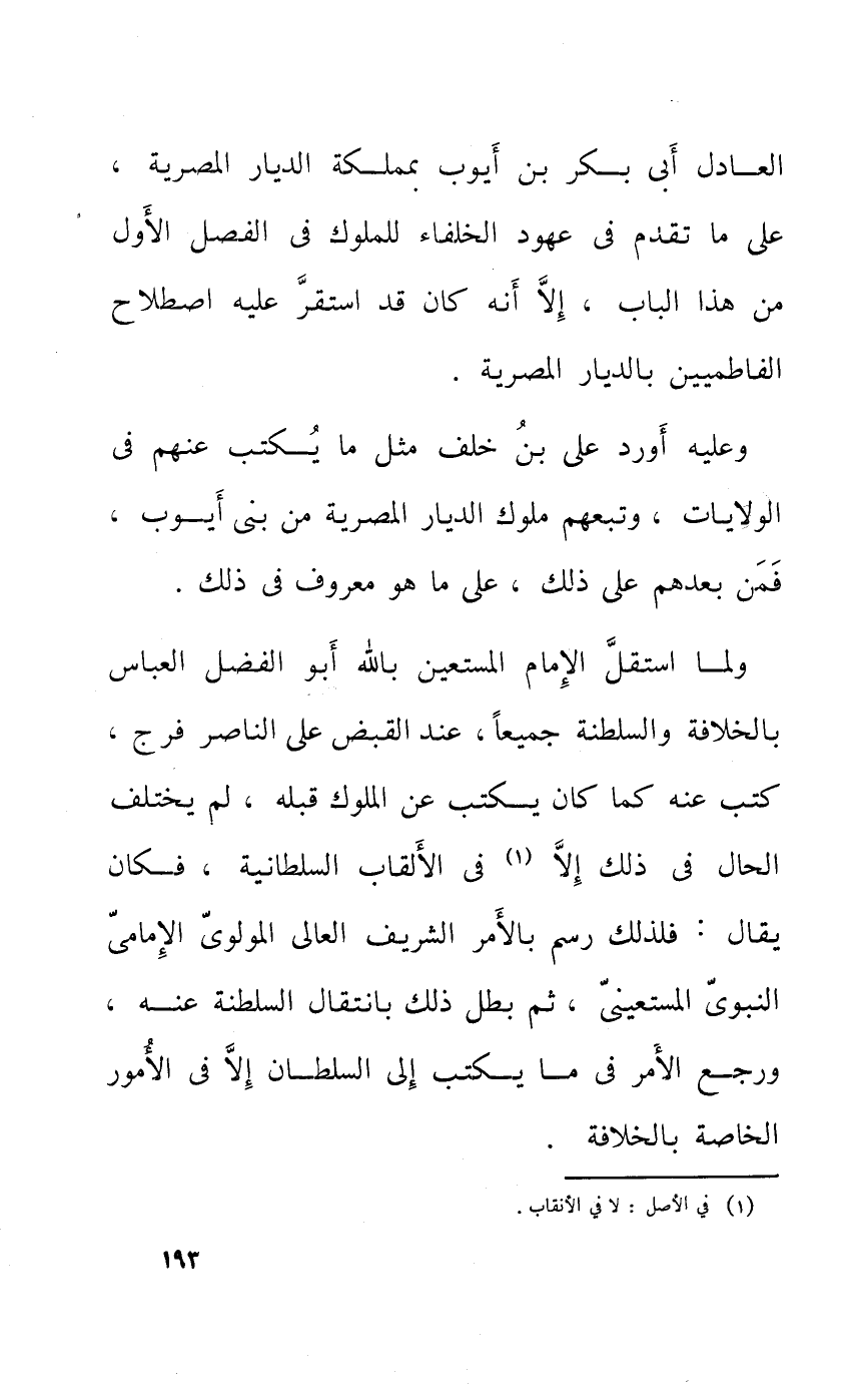 الْعَادِل أبي بكر بن أَيُّوب بمملكة الديار المصرية على مَا تقدم فِي عهود الْخُلَفَاء للملوك فِي الْفَصْل الأول من هَذَا الْبَاب إِلَّا أَنه كَانَ قد اسْتَقر عَلَيْهِ اصْطِلَاح الفاطميين بالديار المصرية