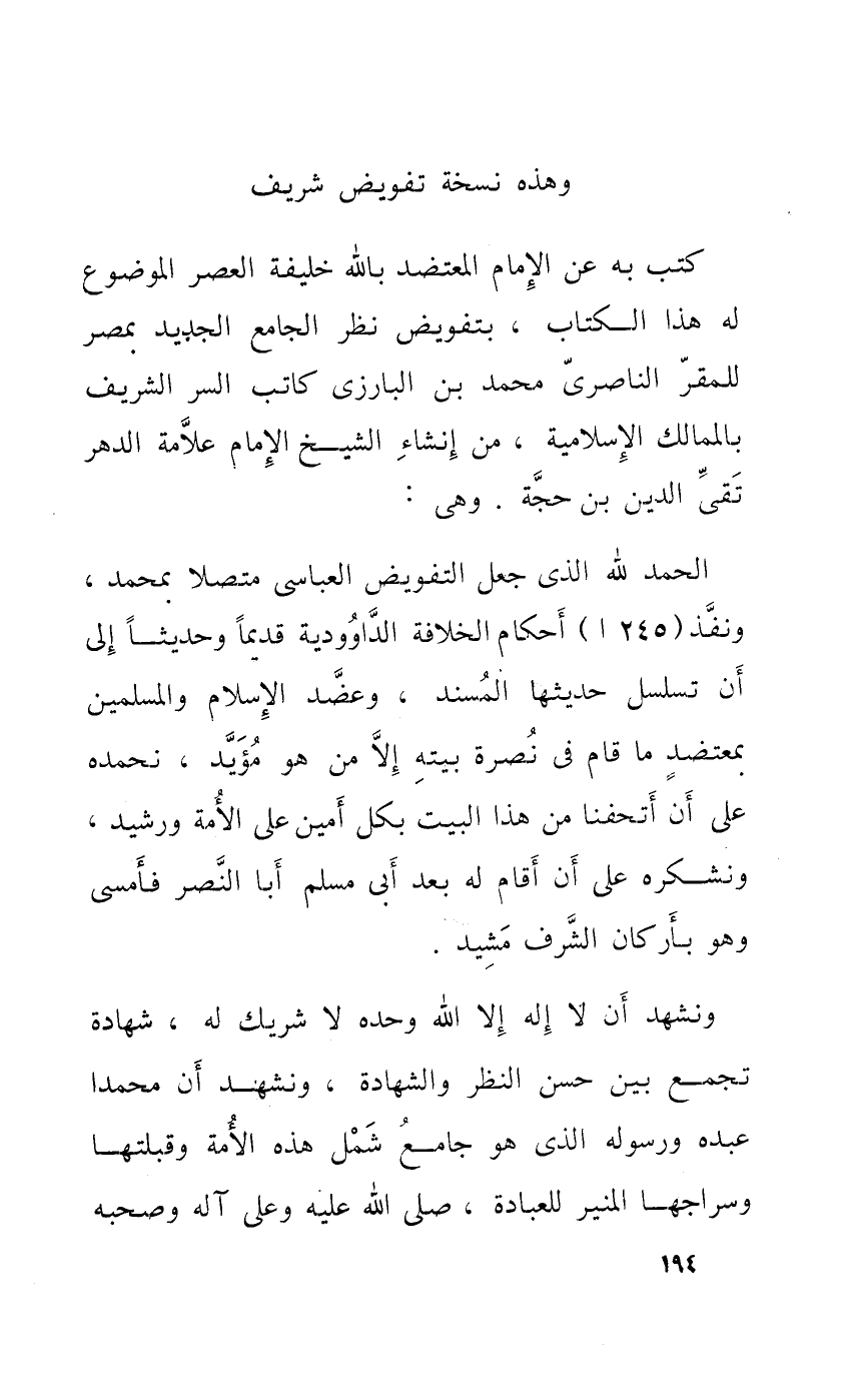 كتب بِهِ عَن الإِمَام المعتضد بِاللَّه خَليفَة الْعَصْر الْمَوْضُوع لَهُ هَذَا الْكتاب بتفويض نظر الْجَامِع الْجَدِيد بِمصْر للْمقر الناصري مُحَمَّد بن الْبَارِزِيّ كَاتب السِّرّ الشريف بالممالك الإسلامية من إنْشَاء الشَّيْخ الإِمَام عَلامَة الدَّهْر تَقِيّ الدّين بن حجَّة وَهِي