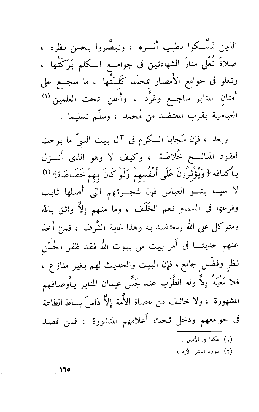 وَبعد فَإِن سجايا الْكَرم فِي آل بَيت النَّبِي مَا بَرحت لعقود المنائح خُلَاصَة وَكَيف لَا وَهُوَ الَّذِي أنزل بأكنافه {ويؤثرون على أنفسهم وَلَو كَانَ بهم خصَاصَة} لَا سِيمَا بَنو الْعَبَّاس فَإِن شجرتهم الَّتِي أَصْلهَا ثَابت وفرعها فِي السَّمَاء نعم الْخلف وَمَا مِنْهُم إِلَّا واثق بِاللَّه ومتوكل على الله ومعتضد بِهِ وَهَذَا غَايَة الشّرف فَمن أَخذ عَنْهُم حَدِيثا فِي أَمر بَيت من بيُوت الله فقد ظفر بِحسن نظر وَفضل جَامع فَإِن الْبَيْت والْحَدِيث لَهُم بِغَيْر مُنَازع فَلَا معبد إِلَّا وَله الطَّرب عِنْد جس عيدَان المنابر بأوصافهم الْمَشْهُورَة وَلَا خَائِف من عصاة الْأمة إِلَّا داس بِسَاط الطَّاعَة فِي جوامعهم وَدخل تَحت أعلامهم المنشورة فَمن قصد