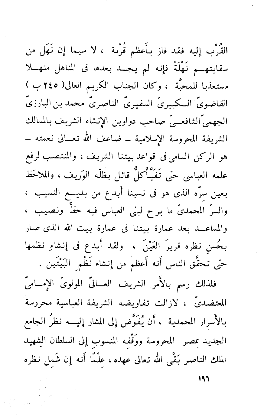 الْقرب إِلَيْهِ فقد فَازَ بأعظم قربَة لَا سِيمَا إِن نهل من سقايتهم نهلة فَإِنَّهُ لم يجد بعْدهَا فِي المناهل منهلا مستعذبا للمحبة وَكَانَ الجناب الْكَرِيم العالي القاضوي الكبيري السفيري الناصري مُحَمَّد بن الْبَارِزِيّ الجهمي الشَّافِعِي صَاحب دواوين الْإِنْشَاء الشريف بالممالك الشَّرِيفَة المحروسة الإسلامية ضاعف الله تَعَالَى نعْمَته هُوَ الرُّكْن السَّامِي فِي قَوَاعِد بيتنا الشريف والمنتصب لرفع علمه العباسي حَتَّى تفيأ كل قَائِل بظله الوريف والملاحظ بِعَين سره الَّذِي هُوَ فِي نسبنا أبدع من بديع النسيب والسر المحمدي مَا برح لبنى الْعَبَّاس فِيهِ حَظّ وَنصِيب والمساعد بعد عمَارَة بيتنا فِي عمَارَة بَيت الله الَّذِي صَار بِحسن نظره قرير الْعين وَلَقَد أبدع فِي إنْشَاء نظمها حَتَّى تحقق النَّاس أَنه أعظم من إنْشَاء نظم الْبَيْتَيْنِ