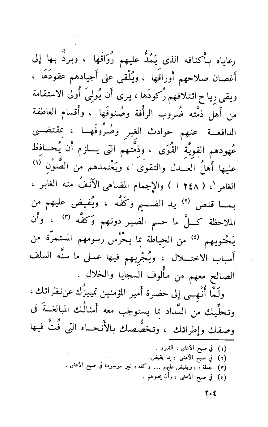 رعاياه بأكنافه الَّذِي يمد عَلَيْهِم رواقها وَيرد بهَا إِلَى أَغْصَان صَلَاحهمْ أوراقها ويلقي على أجيادهم عقودها ويقي ريَاح ائتلافهم ركودها يرى أَن يولي أولي الاسْتقَامَة من أهل ذمَّته ضروب الرأفة وصنوفها وأقسام العاطفة الدافعة عَنْهُم حوادث الْغَيْر وصروفها بِمُقْتَضى عهودهم القوية القوى وذمتهم الَّتِي يلْزم أَن يحافظ عَلَيْهَا أهل الْعدْل وَالتَّقوى ويغتمدهم من الصون الغامر والإجمام المضاهى الآنف مِنْهُ الغابر بِمَا قنص يَد الضيم وكفه وَيفِيض عَلَيْهِم من الملاحظة كل مَا حسم الضير دونهم وكفه وَأَن يحتويهم من الحياطة يما يحرس رسومهم المستمرة من أَسبَاب الاختلال ويجريهم فِيهَا على مَا سنه السّلف الصَّالح مَعَهم من مألوف السجايا والخلال