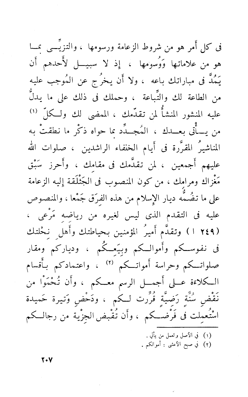 فِي كل أَمر هُوَ من شُرُوط الزعامة ورسومها والتزيي بِمَا هُوَ من علاماتها ووسومها إِذْ لَا سَبِيل لأَحَدهم أَن يمد فِي مباراتك بَاعه وَلَا أَن يخرج عَن الْمُوجب عَلَيْهِ من الطَّاعَة لَك والتباعة وحملك فِي ذَلِك على مَا يدل عَلَيْهِ المنشور المنشأ لمن تقدمك الممضي لَك وَلكُل من يَأْتِي بعْدك المجدد بِمَا حواه ذكر مَا نطقت بِهِ المناشير المقررة فِي أَيَّام الْخُلَفَاء الرَّاشِدين صلوَات الله عَلَيْهِم أَجْمَعِينَ لمن تقدمك فِي مقامك وأحرز سبق مغزاك ومرامك من كَون الْمَنْصُوب فِي الجثلقة إِلَيْهِ الزعامة على مَا تضمه ديار الْإِسْلَام من هَذِه الْفرق جمعا وَالْمَنْصُوص عَلَيْهِ فِي التَّقَدُّم الَّذِي لَيْسَ لغيره من رياضه مرعى وَتقدم أَمِير الْمُؤمنِينَ بحياطتك وَأهل نحلتك فِي نفوسكم وَأَمْوَالكُمْ وَبَيْعكُمْ ودياركم ومقار صلواتكم وحراسة أمواتكم واعتمادكم بأقسام الكلاءة على أجمل الرَّسْم مَعكُمْ وَأَن تحموا من نقض سنة رضية قررت لكم ودحض وتيرة حميدة اسْتعْملت فِي فرضكم وَأَن تقبض الْجِزْيَة من رجالكم