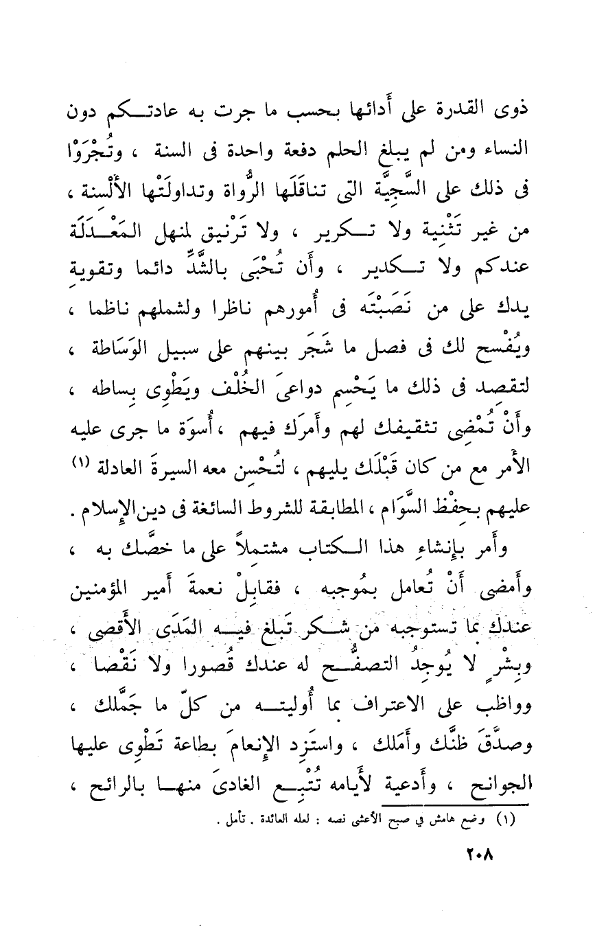 ذَوي الْقُدْرَة على أَدَائِهَا بِحَسب مَا جرت بِهِ عادتكم دون النِّسَاء وَمن لم يبلغ الْحلم دفْعَة وَاحِدَة فِي السّنة وتجروا فِي ذَلِك على السجية الَّتِي تناقلها الروَاة وتداولتها الْأَلْسِنَة من غير تَثْنِيَة وَلَا تَكْرِير وَلَا ترنيق لمنهل المعدلة عنْدكُمْ وَلَا تكدير وَأَن تحيى بالشد دَائِما وتقوية يدك على من نصبته فِي أُمُورهم نَاظرا ولشملهم ناظما ويفسح لَك فِي فصل مَا شجر بَينهم على سَبِيل الوساطة لتقصد فِي ذَلِك مَا يحسم دواعي الْخلف ويطوي بساطه وَأَن تمْضِي تثقيفك لَهُم وأمرك فيهم أُسْوَة مَا جرى عَلَيْهِ الْأَمر مَعَ من كَانَ قبلك يليهم لتحسن مَعَه السِّيرَة العادلة عَلَيْهِم بِحِفْظ السوام الْمُطَابقَة للشروط السائغة فِي دين الْإِسْلَام