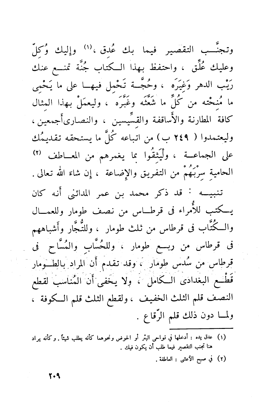 تَنْبِيه قد ذكر مُحَمَّد بن عمر الْمَدَائِنِي أَنه كَانَ يكْتب لِلْأُمَرَاءِ فِي قرطاس من نصف طومار وللعمال وَالْكتاب فِي قرطاس من ثلث طومار وللتجار وأشباههم فِي قرطاس من ربع طومار وللحساب والمساح فِي قرطاس من سدس طومار وَقد تقدم أَن المُرَاد بالطومار قطع الْبَغْدَادِيّ الْكَامِل وَلَا يخفى أَن الْمُنَاسب لقطع النّصْف قلم الثُّلُث الْخَفِيف ولقطع الثُّلُث قلم الْكُوفَة وَلما دون ذَلِك قلم الرّقاع