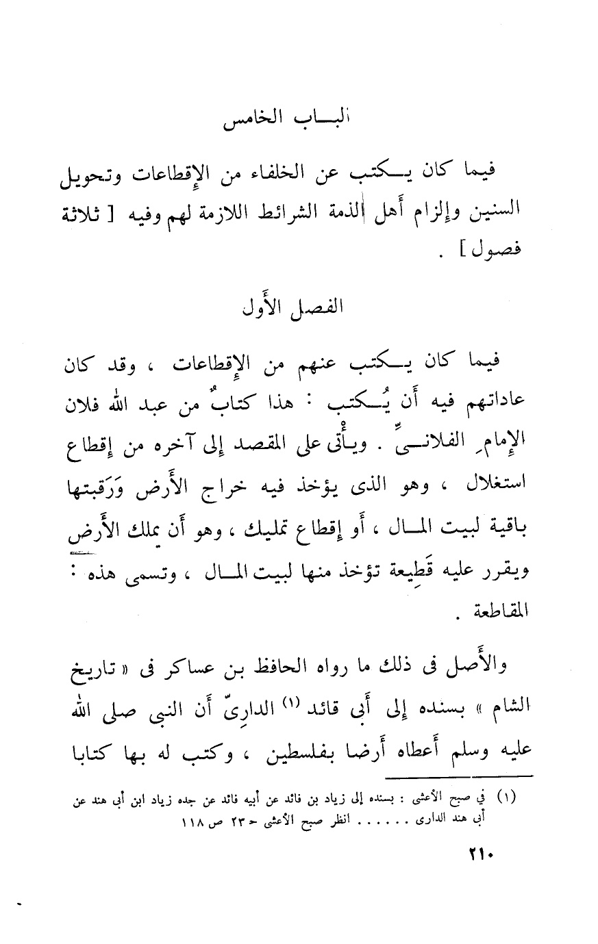 فِيمَا كَانَ يكْتب عَن الْخُلَفَاء من الإقطاعات وتحويل السنين وإلزام أهل الذِّمَّة الشَّرَائِط اللَّازِمَة لَهُم وَفِيه ثَلَاثَة فُصُول
