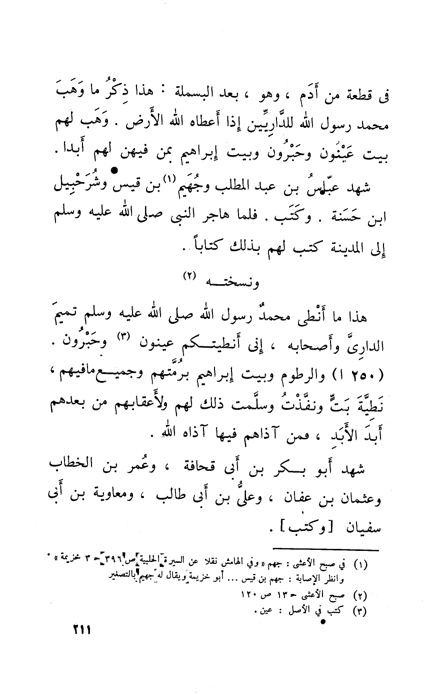 فِي قِطْعَة أَدَم وَهُوَ بعد الْبَسْمَلَة هَذَا ذكر مَا وهب مُحَمَّد رَسُول الله للداريين إِذا أعطَاهُ الله الأَرْض وهب لَهُم بَيت عينون وحبرون وَبَيت ابراهيم بِمن فِيهِنَّ لَهُم أبدا