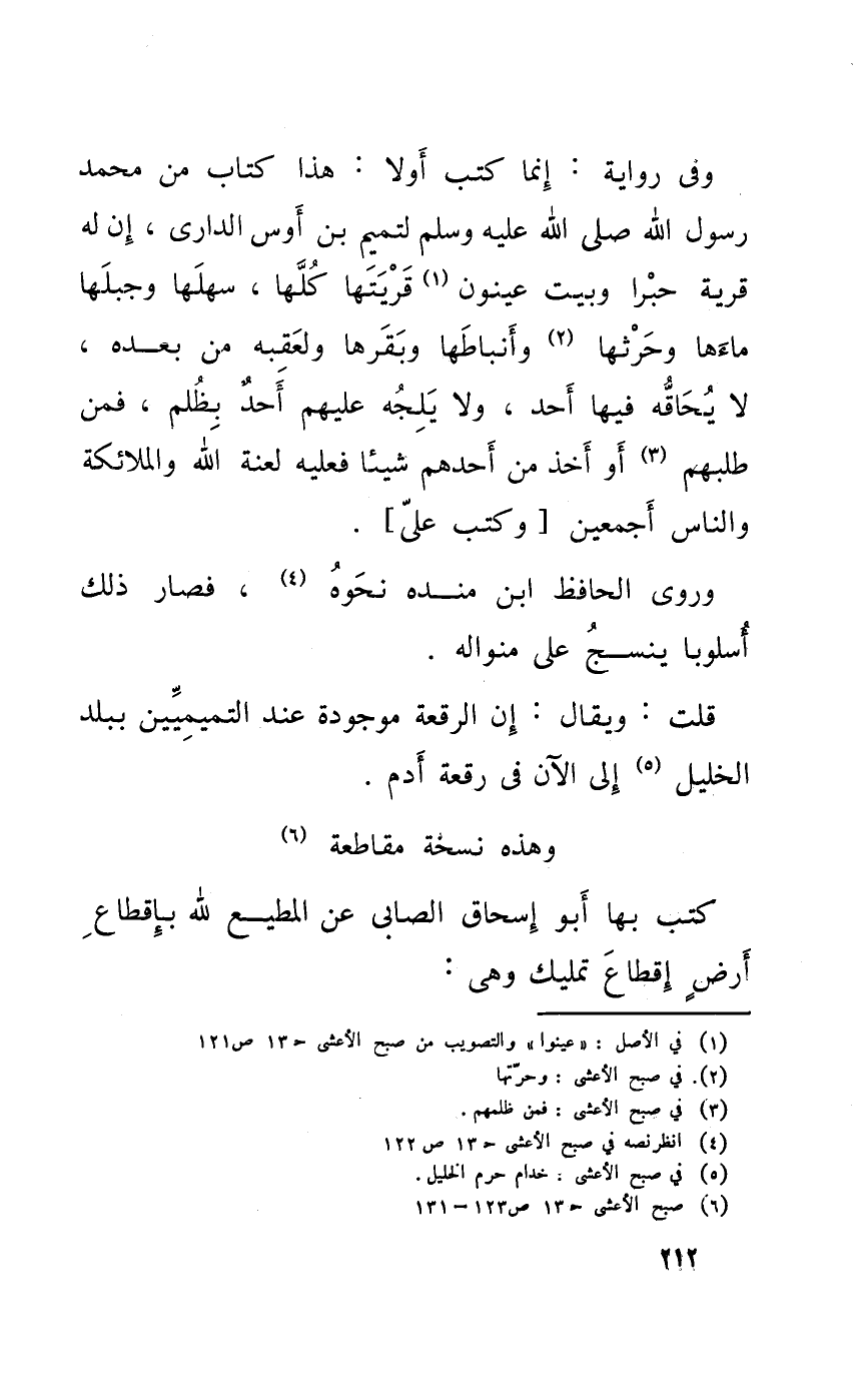 وَفِي رِوَايَة إِنَّمَا كتب أَولا هَذَا كتاب من مُحَمَّد رَسُول الله صلى الله عَلَيْهِ وَسلم لتميم بن أَوْس الدَّارِيّ إِن لَهُ قَرْيَة حبرًا وَبَيت عينون قريتها كلهَا سهلها وجبلها ماءها وحرثها وأنباطها وبقرها ولعقبه من بعده لَا يحاقه فِيهَا أحد وَلَا يلجه عَلَيْهِم أحد بظُلْم فَمن طَلَبهمْ أَو أَخذ من أحدهم شَيْئا فَعَلَيهِ لعنة الله وَالْمَلَائِكَة وَالنَّاس أَجْمَعِينَ وَكتب عَليّ
