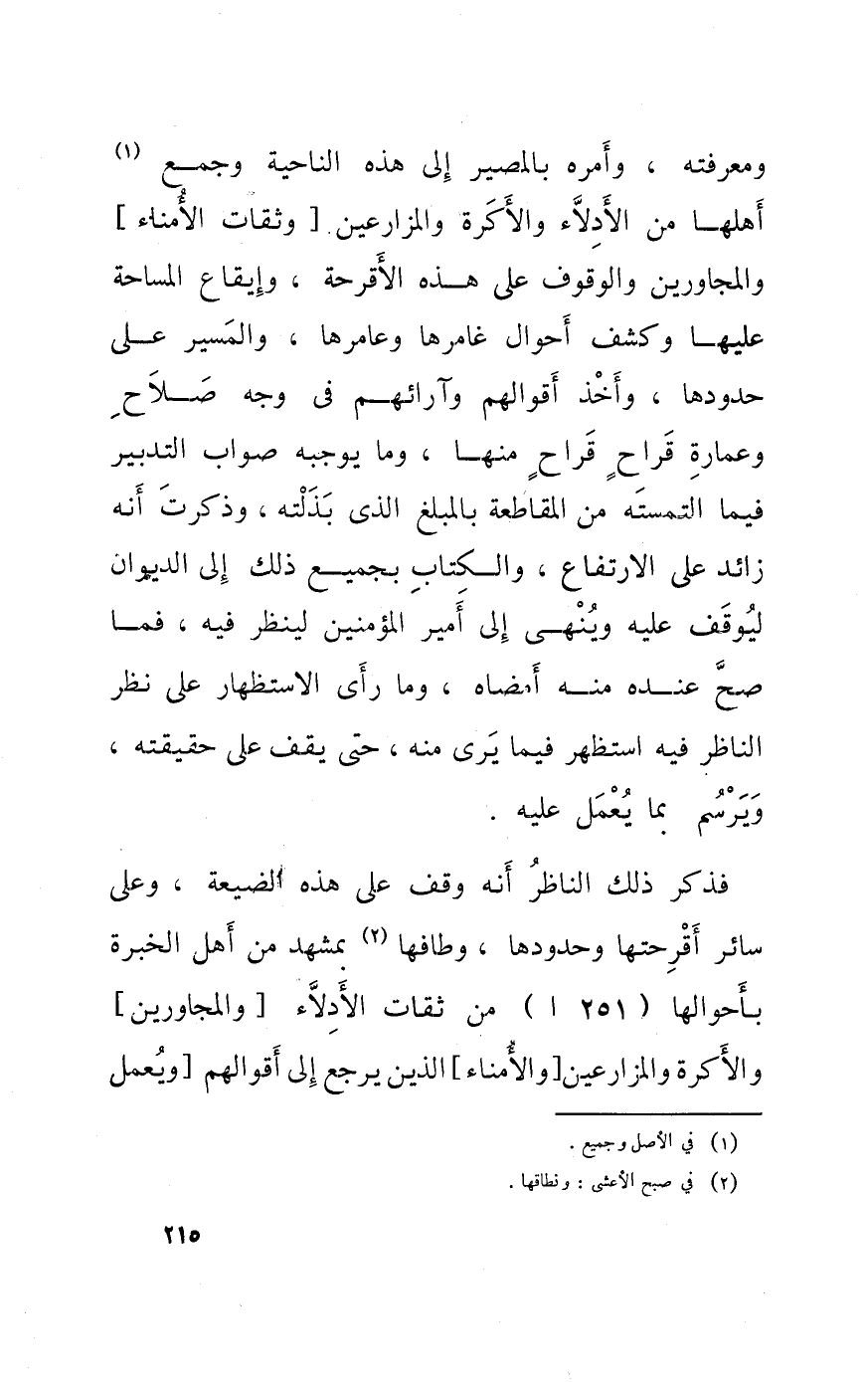 ومعرفته وَأمره بالمصير إِلَى هَذِه النَّاحِيَة وَجمع أَهلهَا من الأدلاء والأكرة والمزارعين وثقات الْأُمَنَاء والمجاورين وَالْوُقُوف على هَذِه الأقرحة وإيقاع المساحة عَلَيْهَا وكشف أَحْوَال غامرها وعامرها والمسير على حُدُودهَا وَأخذ أَقْوَالهم وآرائهم فِي وَجه صَلَاح وَعمارَة قراح قراح مِنْهَا وَمَا يُوجِبهُ صَوَاب التَّدْبِير فِيمَا التمسته من المقاطعة بالمبلغ الَّذِي بذلته وَذكرت أَنه زَائِد على الِارْتفَاع وَالْكتاب بِجَمِيعِ ذَلِك إِلَى الدِّيوَان ليوقف عَلَيْهِ وَينْهى إِلَى أَمِير الْمُؤمنِينَ لينْظر فِيهِ فَمَا صَحَّ عِنْده مِنْهُ أَمْضَاهُ وَمَا رأى الِاسْتِظْهَار على نظر النَّاظر فِيهِ استظهر فِيمَا يرى مِنْهُ حَتَّى يقف على حَقِيقَته ويرسم بِمَا يعْمل عَلَيْهِ