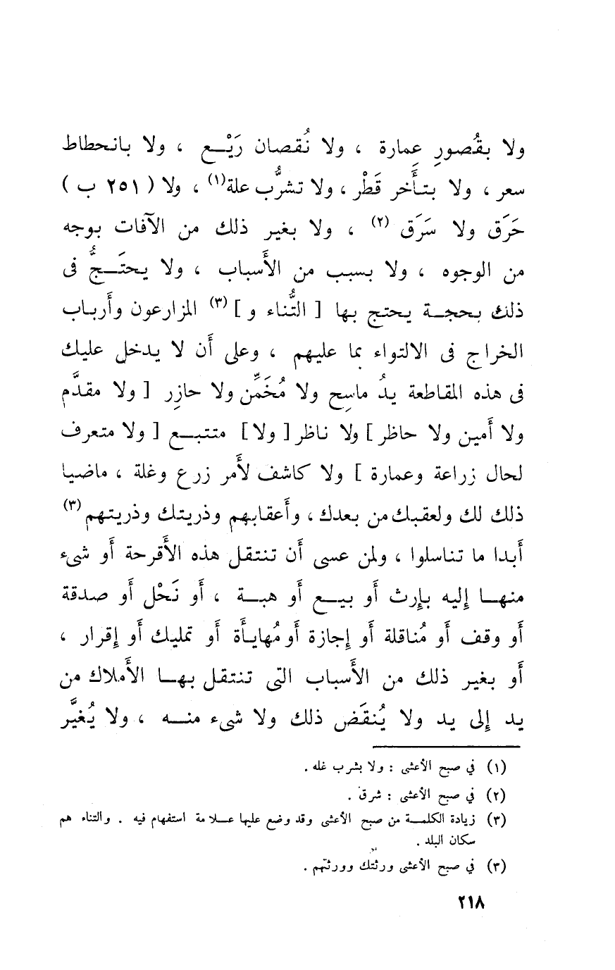 وَلَا بقصور عمَارَة وَلَا نُقْصَان ريع وَلَا بانحطاط سعر وَلَا بتأخر قطر وَلَا تشرب عِلّة وَلَا حرق وَلَا سرق وَلَا بِغَيْر ذَلِك من الْآفَات بِوَجْه من الْوُجُوه وَلَا بِسَبَب من الْأَسْبَاب وَلَا يحْتَج فِي ذَلِك بِحجَّة يحْتَج بهَا التناء والمزارعون وأرباب الْخراج فِي الالتواء بِمَا عَلَيْهِم وعَلى أَن لَا يدْخل عَلَيْك فِي هَذِه المقاطعة يَد ماسح وَلَا مخمن وَلَا حازر وَلَا مقدم وَلَا أَمِين وَلَا حاظر وَلَا نَاظر وَلَا متتبع وَلَا متعرف لحَال زراعة وَعمارَة وَلَا كاشف لأمر زرع وغلة مَاضِيا ذَلِك لَك ولعقبك من بعْدك وَأَعْقَابهمْ وذريتك وذريتهم أبدا مَا تَنَاسَلُوا وَلمن عَسى أَن تنْتَقل هَذِه الأقرحة أَو شَيْء مِنْهَا إِلَيْهِ بِإِرْث أَو بيع أَو هبة أَو نحل أَو صَدَقَة أَو وقف أَو مناقلة أَو إِجَارَة أَو مُهَايَأَة أَو تمْلِيك أَو إِقْرَار أَو بِغَيْر ذَلِك من الْأَسْبَاب الَّتِي تنْتَقل بهَا الْأَمْلَاك من يَد إِلَى يَد وَلَا ينْقض ذَلِك وَلَا شَيْء مِنْهُ وَلَا يُغير
