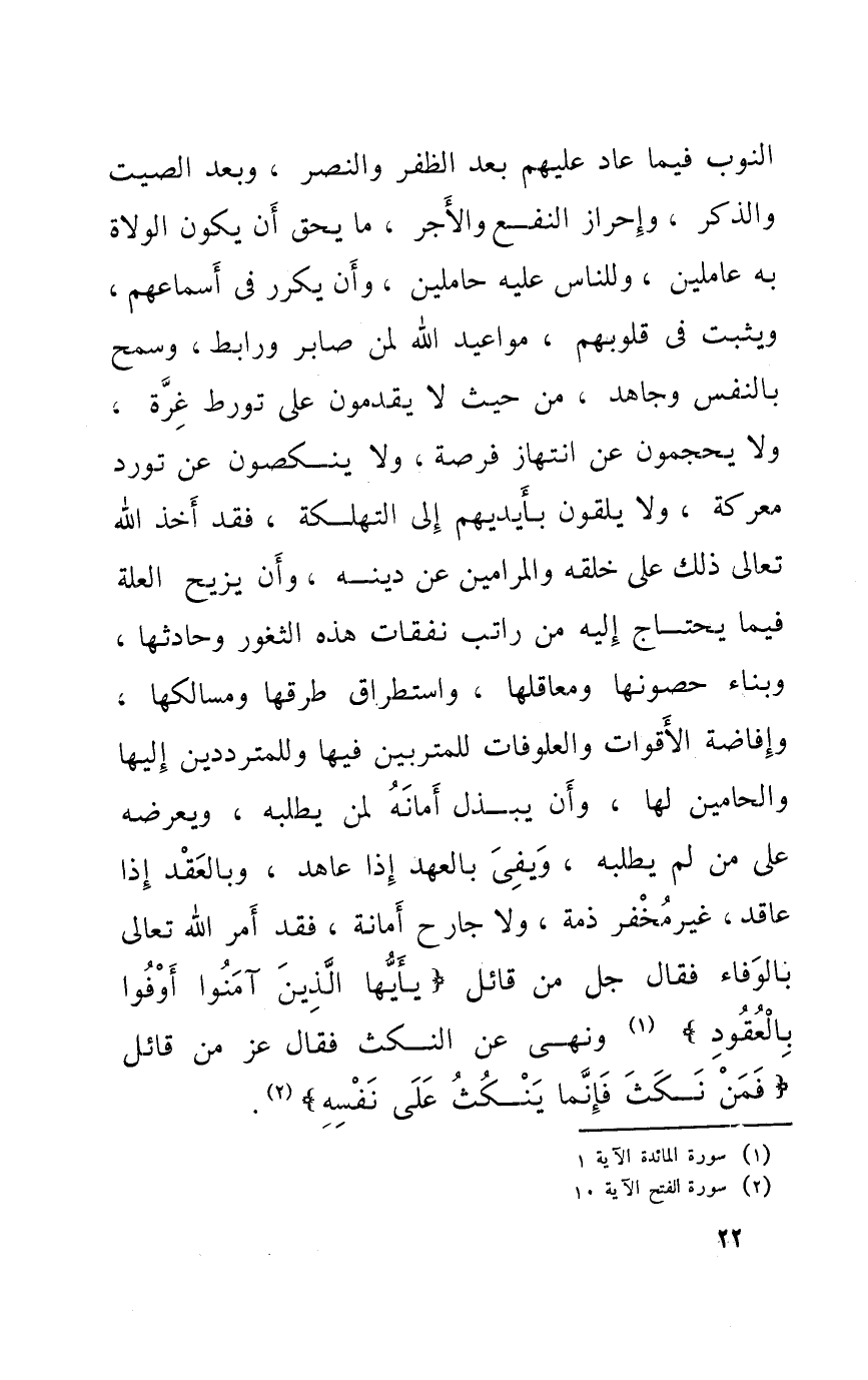 النوب فِيمَا عَاد عَلَيْهِم بعد الظفر والنصر وَبعد الصيت وَالذكر وإحراز النَّفْع وَالْأَجْر مَا يحِق أَن يكون الْوُلَاة بِهِ عاملين وَلِلنَّاسِ عَلَيْهِ حاملين وَأَن يُكَرر فِي أسماعهم وَيثبت فِي قولبهم مواعيد الله لمن صابر ورابط وسمح بِالنَّفسِ وجاهد من حَيْثُ لَا يقدمُونَ على تورط غرَّة وَلَا يحجمون عَن إنتهاز فرْصَة وَلَا ينكصون عَن تورد معركة وَلَا يلقون بِأَيْدِيهِم إِلَى التَّهْلُكَة فقد أَخذ الله تَعَالَى ذَلِك على خلقه والمرامين عَن دينه وَأَن يزيح الْعلَّة فِيمَا يحْتَاج إِلَيْهِ من راتب نفقات هَذِه الثغور وحادثها وَبِنَاء حصونها ومعاقلها وإستطراق طرقها ومسالكها وإفاضة الأقوات والعلوفات للمتربين فِيهَا وللمترددين إِلَيْهَا والمحامين لَهَا وَأَن يبْذل أَمَانه لمن يَطْلُبهُ ويعرضه على من لم يَطْلُبهُ ويفي بالعهد إِذا عَاهَدَ وبالعقد إِذا عَاقد غير مخفر ذمَّة وَلَا جارح أَمَانَة فقد أَمر الله تَعَالَى فَقَالَ جلّ من قَائِل {يَا أَيهَا الَّذين آمنُوا أَوْفوا بِالْعُقُودِ} وَنهى عَن النكث فَقَالَ عز من قَائِل {فَمن نكث فَإِنَّمَا ينْكث على نَفسه}