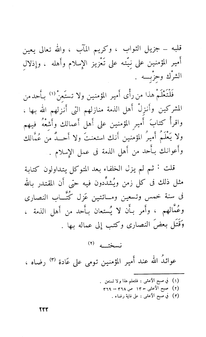 فلتعلم هَذَا من رَأْي أَمِير الْمُؤمنِينَ وَلَا تستعن بِأحد من الْمُشْركين وَأنزل أهل الذِّمَّة مَنَازِلهمْ الَّتِي أنزلهم الله بهَا واقرأ كتاب أَمِير الْمُؤمنِينَ على أهل أعمالك وأشعه فيهم وَلَا يعلم أَمِير الْمُؤمنِينَ أَنَّك استعنت وَلَا أحد من عمالك وأعوانك بِأحد من أهل الذِّمَّة فِي عمل الْإِسْلَام