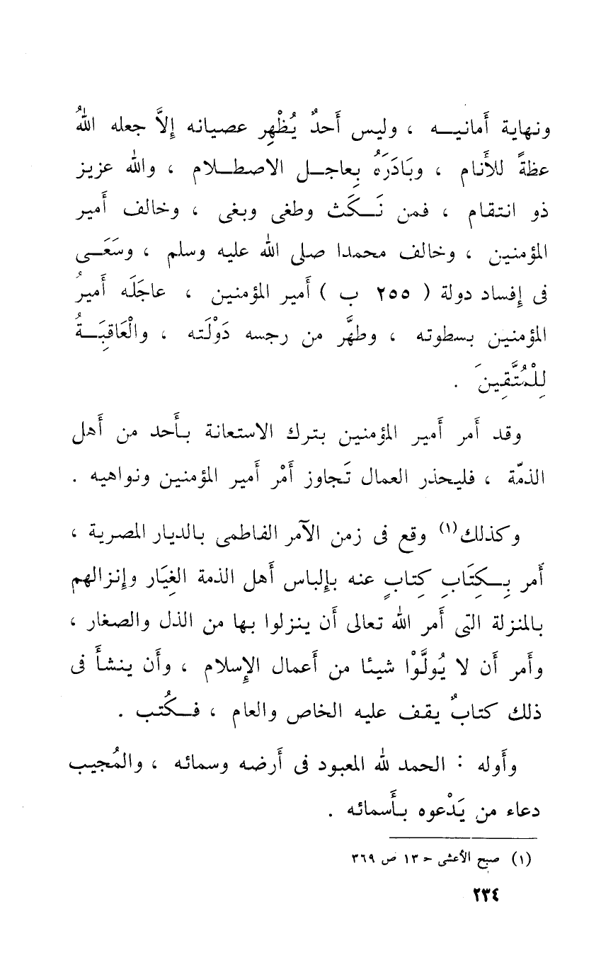 وَكَذَلِكَ وَقع فِي زمن الْآمِر الفاطمي بالديار المصرية أَمر بِكِتَاب كتاب عَنهُ بإلباس أهل الذِّمَّة الغيار وَإِنْزَالهمْ بالمنزلة الَّتِي أَمر الله تَعَالَى أَن ينزلُوا بهَا من الذل وَالصغَار وَأمر أَن لَا يولوا شَيْئا من أَعمال الْإِسْلَام وَأَن ينشأ فِي ذَلِك كتاب يقف عَلَيْهِ الْخَاص وَالْعَام فَكتب