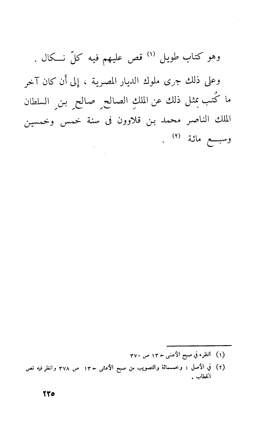 وعَلى ذَلِك جرى مُلُوك الديار المصرية إِلَى أَن كَانَ آخر مَا كتب بِمثل ذَلِك عَن الْملك الصَّالح صَالح بن السُّلْطَان الْملك النَّاصِر مُحَمَّد بن قلاوون فِي سنة خمس وَخمسين وَسبع مائَة