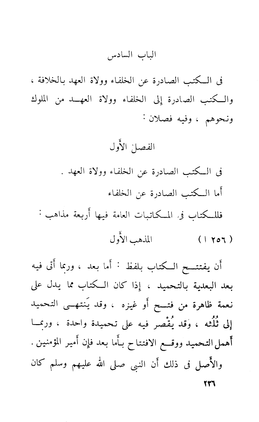 أَن يفْتَتح الْكتاب بِلَفْظ أما بعد وَرُبمَا أَتَى فِيهِ بعد البعدية بالتحميد إِذا كَانَ الْكتاب مِمَّا يدل على نعْمَة ظَاهِرَة من فتح أَو غَيره وَقد يَنْتَهِي التَّحْمِيد إِلَى ثلثه وَقد يقصر فِيهِ على تَحْمِيدَة وَاحِدَة وَرُبمَا أهمل التَّحْمِيد وَوَقع الِافْتِتَاح بأما بعد فَإِن أَمِير الْمُؤمنِينَ