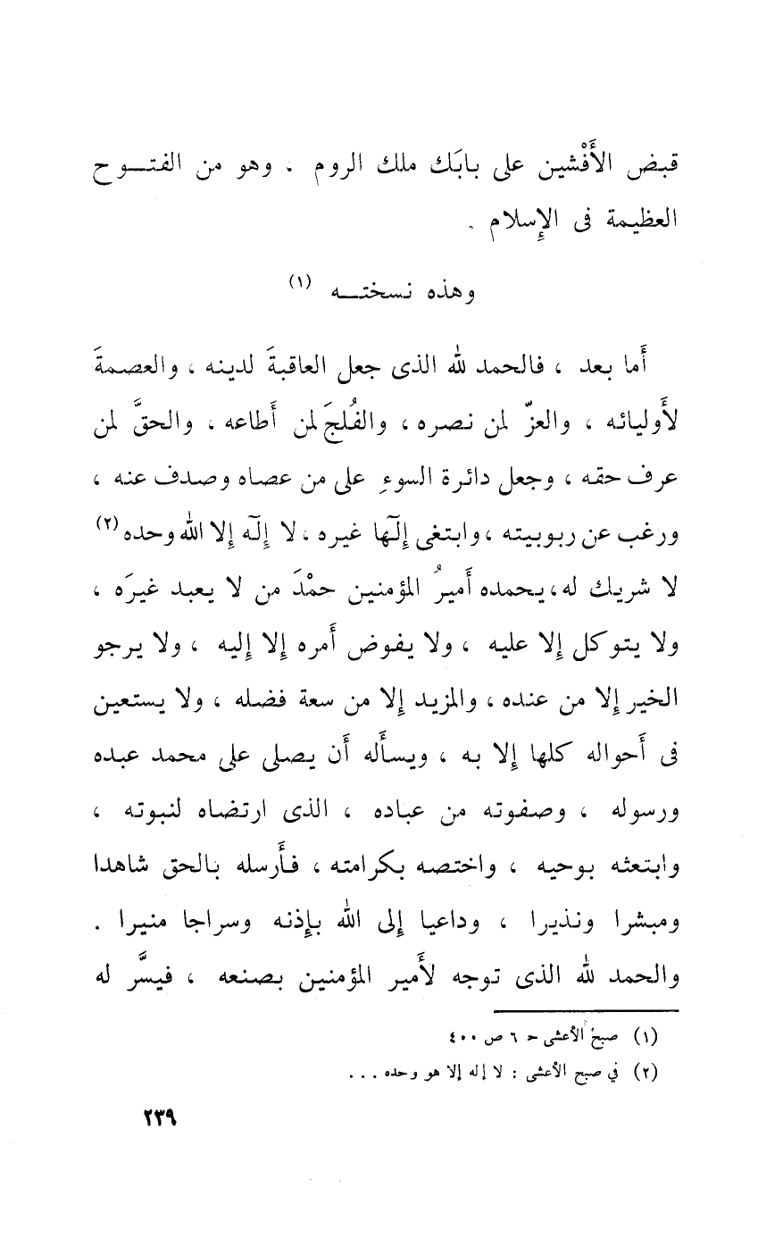 أما بعد فَالْحَمْد لله الَّذِي جعل الْعَاقِبَة لدينِهِ والعصمة لأوليائه والعز لمن نَصره والفلج لمن أطاعه وَالْحق لمن عرف حَقه وَجعل دَائِرَة السوء على من عَصَاهُ وصدف عَنهُ وَرغب عَن ربوبيته وابتغى إِلَهًا غَيره لَا إِلَه إِلَّا الله وَحده لَا شريك لَهُ يحمده أَمِير الْمُؤمنِينَ حمد من لَا يعبد غَيره وَلَا يتوكل إِلَّا عَلَيْهِ وَلَا يُفَوض أمره إِلَّا إِلَيْهِ وَلَا يَرْجُو الْخَيْر إِلَّا من عِنْده والمزيد إِلَّا من سَعَة فَضله وَلَا يَسْتَعِين فِي أَحْوَاله كلهَا إِلَّا بِهِ ويسأله أَن يُصَلِّي على مُحَمَّد عَبده وَرَسُوله وصفوته من عباده الَّذِي ارْتَضَاهُ لنبوته وابتعثه بوحيه واختصه بكرامته فَأرْسلهُ بِالْحَقِّ شَاهدا وَمُبشرا وَنَذِيرا وداعيا إِلَى الله بِإِذْنِهِ وسراجا منيرا وَالْحَمْد لله الَّذِي توجه لأمير الْمُؤمنِينَ بصنعه فيسر لَهُ