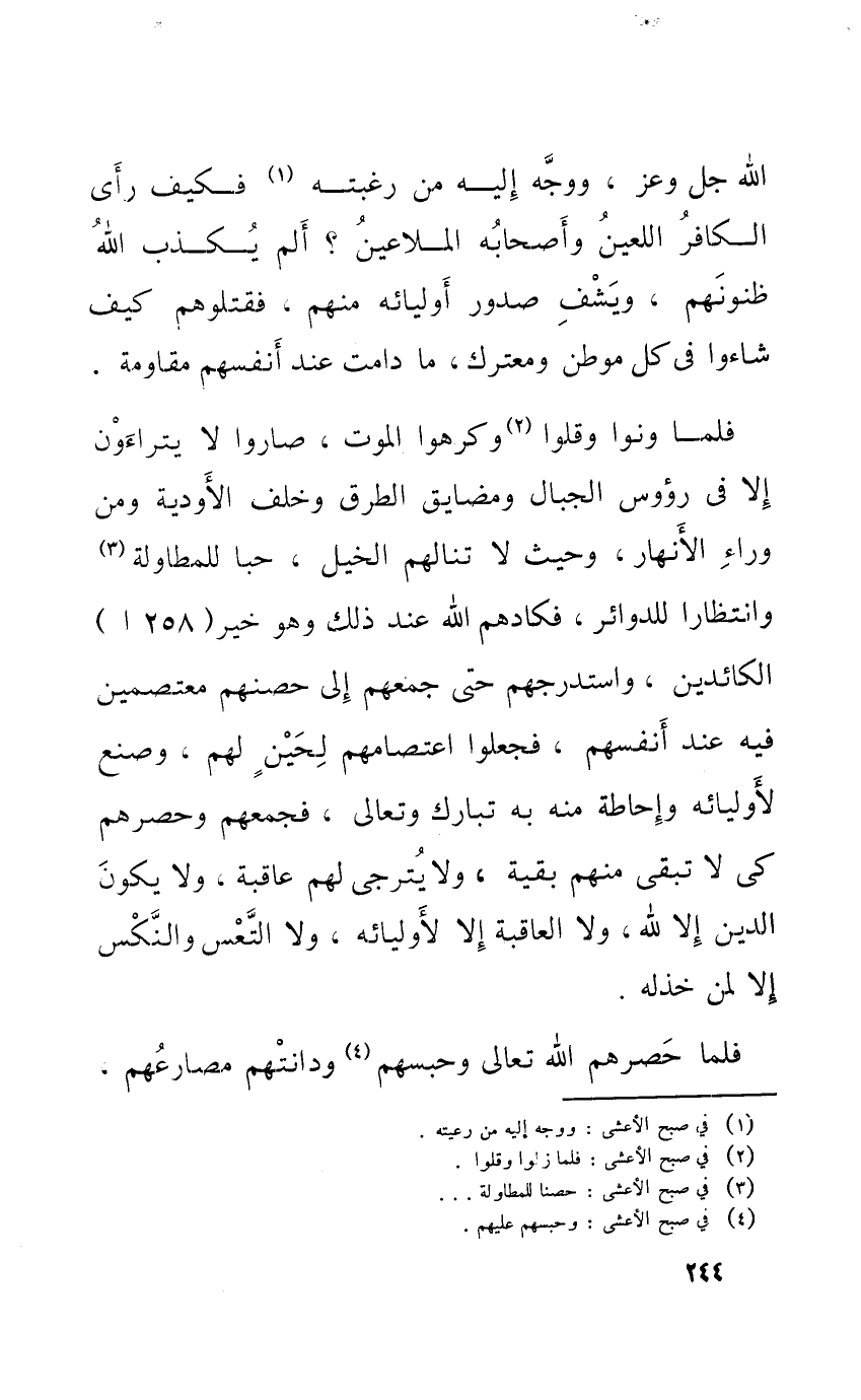 الله جلّ وَعز وَوجه إِلَيْهِ من رغبته فَكيف رأى الْكَافِر اللعين وَأَصْحَابه الملاعين ألم يكذب الله ظنونهم ويشف صُدُور أوليائه مِنْهُم فَقَتَلُوهُمْ كَيفَ شَاءُوا فِي كل موطن ومعترك مَا دَامَت عِنْد أنفسهم مقاومة
