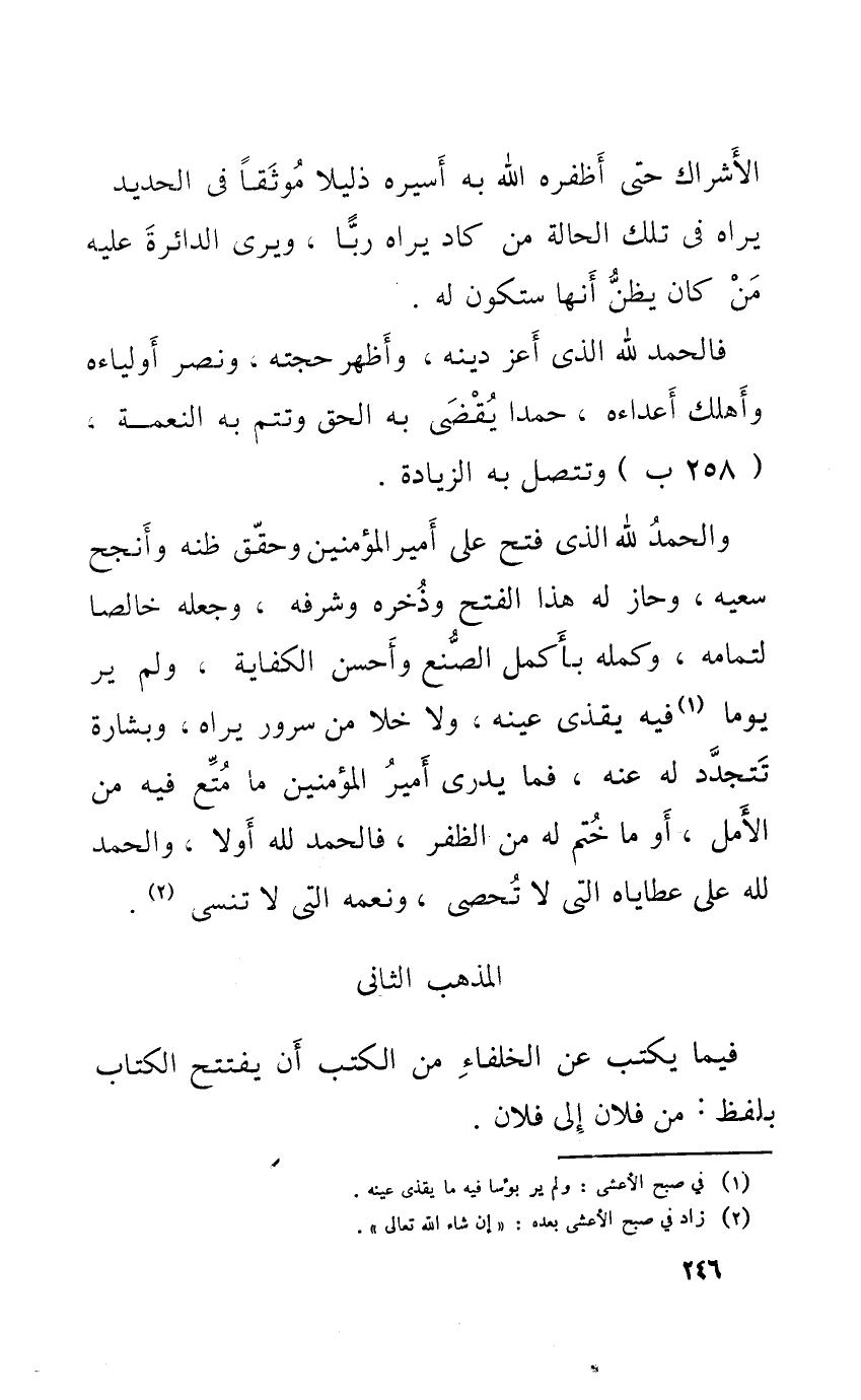 وَالْحَمْد لله الَّذِي فتح على أَمِير الْمُؤمنِينَ وحقق ظَنّه وأنجح سَعْيه وَحَازَ لَهُ هَذَا الْفَتْح وذخره وشرفه وَجعله خَالِصا لتمامه وكمله بأكمل الصنع وَأحسن الْكِفَايَة وَلم ير يَوْمًا فِيهِ يقذى عينه وَلَا خلا من سرُور يرَاهُ وَبشَارَة تتجدد لَهُ عَنهُ فَمَا يدْرِي أَمِير الْمُؤمنِينَ مَا متع فِيهِ من الأمل أَو مَا ختم لَهُ من الظفر فَالْحَمْد لله أَولا وَالْحَمْد لله على عطاياه الَّتِي لَا تحصى ونعمه الَّتِي لَا تنسى