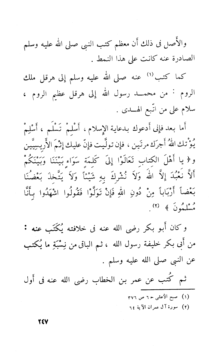أما بعد فَإِنِّي أَدْعُوك بِدِعَايَةِ الْإِسْلَام أسلم تسلم أسلم يؤتك الله أجرك مرَّتَيْنِ فَإِن توليت فَإِن عَلَيْك إِثْم الأريسيين و {يَا أهل الْكتاب تَعَالَوْا إِلَى كلمة سَوَاء بَيْننَا وَبَيْنكُم أَلا نعْبد إِلَّا الله وَلَا نشْرك بِهِ شَيْئا وَلَا يتَّخذ بَعْضنَا بَعْضًا أَرْبَابًا من دون الله فَإِن توَلّوا فَقولُوا اشْهَدُوا بِأَنا مُسلمُونَ}