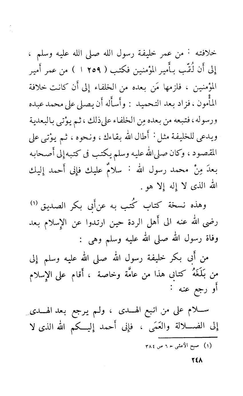من أبي بكر خَليفَة رَسُول الله صلى الله عَلَيْهِ وَسلم إِلَى من بلغه كتابي هَذَا من عَامَّة وخاصة أَقَامَ على الْإِسْلَام أَو رَجَعَ عَنهُ