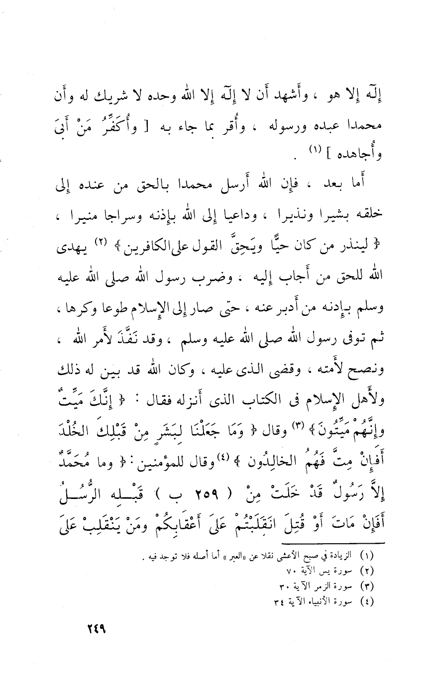 أما بعد فَإِن الله أرسل مُحَمَّدًا بِالْحَقِّ من عِنْده إِلَى خلقه بشيرا وَنَذِيرا وداعيا إِلَى الله بِإِذْنِهِ وسراجا منيرا {لينذر من كَانَ حَيا ويحق القَوْل على الْكَافرين} يهدي الله للحق من أجَاب إِلَيْهِ وَضرب رَسُول الله صلى الله عَلَيْهِ وَسلم بِإِذْنِهِ من أدبر عَنهُ حَتَّى صَار الْإِسْلَام طَوْعًا وَكرها ثمَّ توفى رَسُول الله صلى الله عَلَيْهِ وَسلم وَقد نفذ لأمر الله ونصح لأمته وَقضى الَّذِي عَلَيْهِ وَكَانَ الله قد بَين لَهُ ذَلِك وَلأَهل الْإِسْلَام فِي الْكتاب الَّذِي أنزل فَقَالَ {إِنَّك ميت وَإِنَّهُم ميتون} وَقَالَ {وَمَا جعلنَا لبشر من قبلك الْخلد أَفَإِن مت فهم الخالدون} وَقَالَ للْمُؤْمِنين {وَمَا مُحَمَّد إِلَّا رَسُول قد خلت من قبله الرُّسُل أَفَإِن مَاتَ أَو قتل انقلبتم على أعقابكم وَمن يَنْقَلِب على عَقِبَيْهِ فَلَنْ يضر الله شَيْئا وسيجزي الله الشَّاكِرِينَ}
