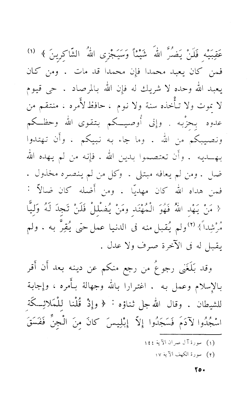 وَقد بَلغنِي رُجُوع من رَجَعَ مِنْكُم عَن دينه بعد أَن أقرّ بِالْإِسْلَامِ وَعمل بِهِ اغْتِرَارًا بِاللَّه وجهالة بأَمْره وَإجَابَة للشَّيْطَان وَقَالَ الله جلّ ثَنَاؤُهُ {وَإِذ قُلْنَا للْمَلَائكَة اسجدوا لآدَم فسجدوا إِلَّا إِبْلِيس كَانَ من الْجِنّ ففسق عَن أَمر ربه أفتتخذونه وَذريته أَوْلِيَاء من دوني وهم لكم عَدو بئس للظالمين بَدَلا}