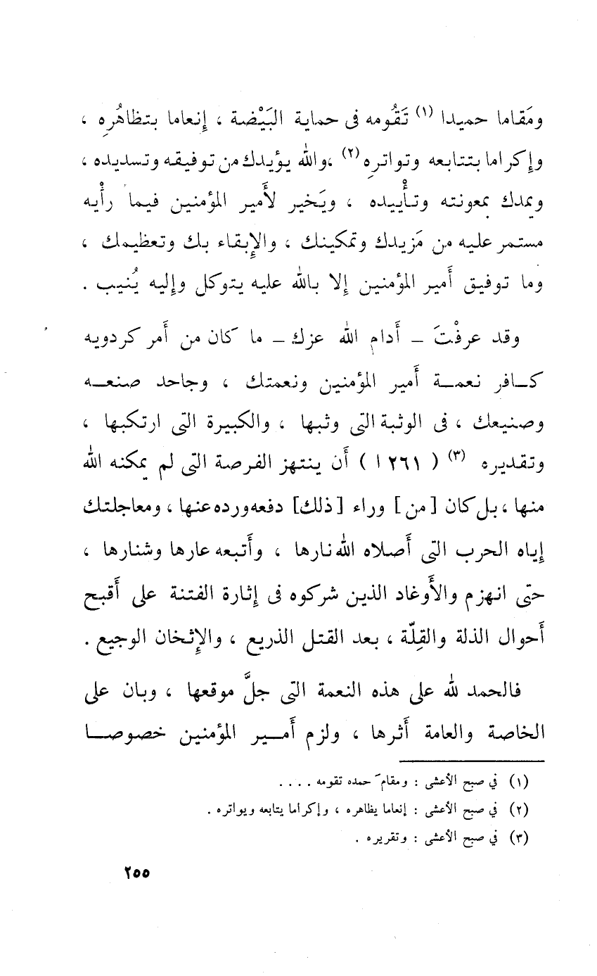 ومقاما حميدا تقومه فِي حماية الْبَيْضَة إنعاما بتظاهره وإكراما بتتابعه وتواتره وَالله يؤيدك من توفيقه وتسديده ويمدك بمعونته وتأييده وَيُخَير لأمير الْمُؤمنِينَ فِيمَا رَأْيه مُسْتَمر عَلَيْهِ من مزيدك وتمكينك والإبقاء بك وتعظيمك وَمَا توفيق أَمِير الْمُؤمنِينَ إِلَّا بِاللَّه عَلَيْهِ يتوكل وَإِلَيْهِ ينيب
