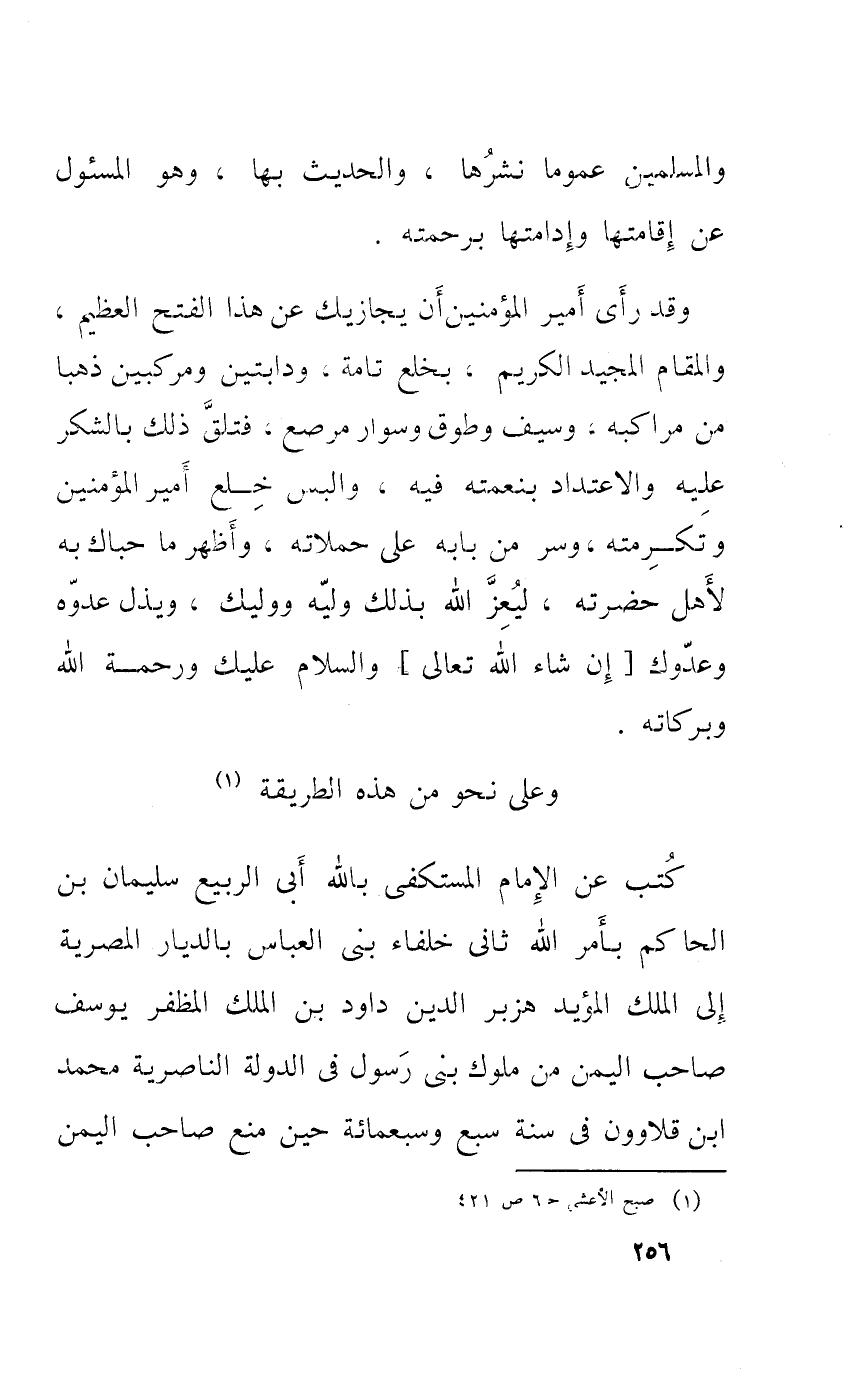 كتب عَن الإِمَام المستكفي بِاللَّه أبي الرّبيع سُلَيْمَان بن الْحَاكِم بِأَمْر الله ثَانِي خلفاء بني الْعَبَّاس بالديار المصرية إِلَى الْملك الْمُؤَيد هزبر الدّين دَاوُد بن الْملك المظفر يُوسُف صَاحب الْيمن من مُلُوك بني رَسُول فِي الدولة الناصرية مُحَمَّد بن قلاوون فِي سنة سبع وَسَبْعمائة حِين منع صَاحب الْيمن