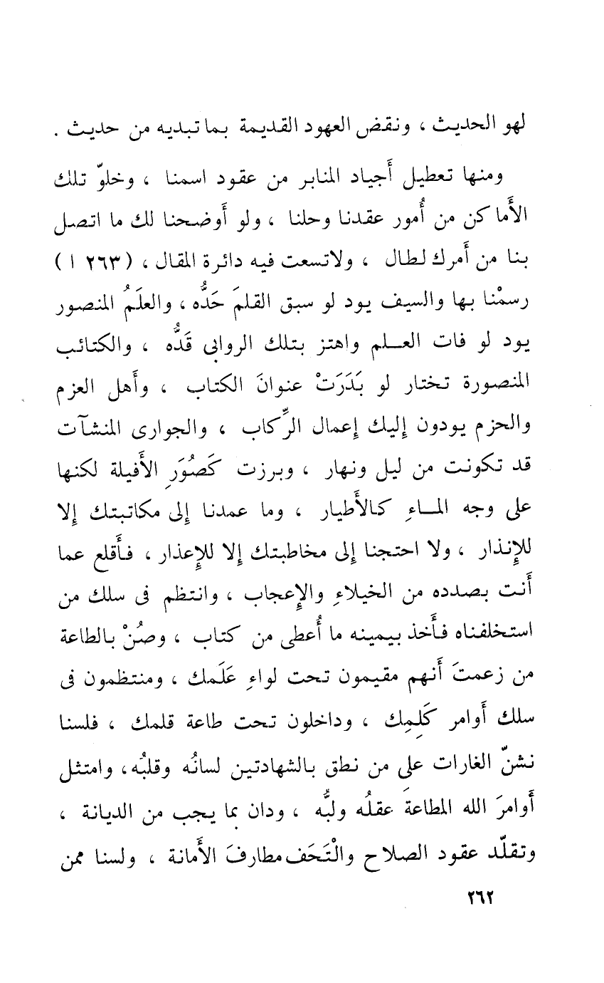 وَمِنْهَا تَعْطِيل أجياد المنابر من عُقُود اسمنا وخلو تِلْكَ الْأَمَاكِن من أُمُور عَقدنَا وحلنا وَلَو أوضحنا لَك مَا اتَّصل بِنَا من أَمرك لطال ولاتسعت فِيهِ دَائِرَة الْمقَال رسمنا بهَا وَالسيف يود لَو سبق الْقَلَم حَده وَالْعلم الْمَنْصُور يود لَو فَاتَ الْعلم واهتز بِتِلْكَ الروابي قده والكتائب المنصورة تخْتَار لَو بدرت عنوان الْكتاب وَأهل الْعَزْم والحزم يودون إِلَيْك إِعْمَال الركاب والجواري الْمُنْشَآت قد تكونت من ليل ونهار وبرزت كصور الأفيلة لَكِنَّهَا على وَجه المَاء كالأطيار وَمَا عمدنا إِلَى مُكَاتَبَتك إِلَّا للإنذار وَلَا احتجنا إِلَى مخاطبتك إِلَّا للإعذار فأقلع عَمَّا أَنْت بصدده من الْخُيَلَاء والإعجاب وانتظم فِي سلك من استخلفناه فَأخذ بِيَمِينِهِ مَا أعْطى من كتاب وصن بِالطَّاعَةِ من زعمت أَنهم مقيمون تَحت لِوَاء علمك ومنتظمون فِي سلك أوَامِر كلمك وداخلون تَحت طَاعَة قلمك فلسنا نشن الغارات على من نطق بِالشَّهَادَتَيْنِ لِسَانه وَقَلبه وامتثل أوَامِر الله المطاعة عقله ولبه ودان بِمَا يجب من الدّيانَة وتقلد عُقُود الصّلاح والتحف مطارف الْأَمَانَة ولسنا مِمَّن