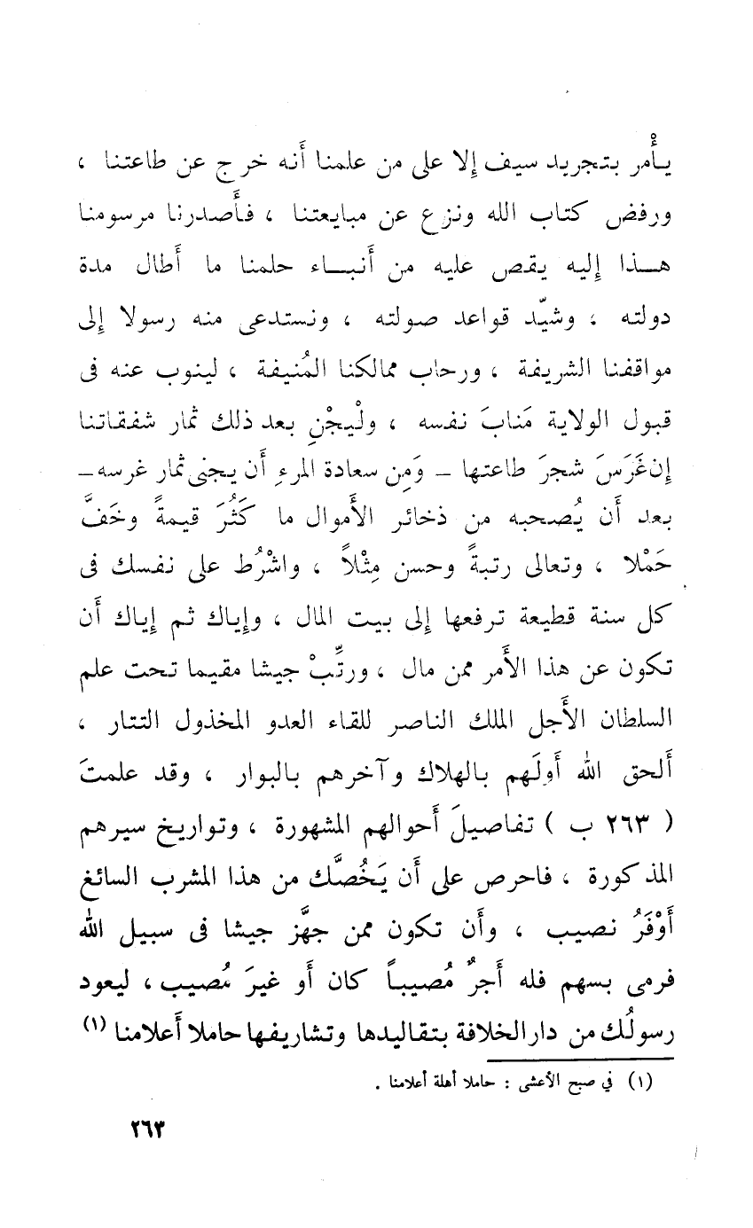 يَأْمر بتجريد سيف إِلَّا على من علمنَا أَنه خرج عَن طاعتنا ورفض كتاب الله وَنزع عَن مبايعتنا فأصدرنا مرسومنا هَذَا إِلَيْهِ يقص عَلَيْهِ من أنباء حلمنا مَا أَطَالَ مُدَّة دولته وشيد قَوَاعِد صولته ونستدعي مِنْهُ رَسُولا إِلَى مواقفنا الشَّرِيفَة ورحاب ممالكنا المنيفة لينوب عَنهُ فِي قبُول الْولَايَة مناب نَفسه وليجن بعد ذَلِك ثمار شفقاتنا إِن غرس شجر طاعتها وَمن سَعَادَة الْمَرْء أَن يجنى ثمار غرسه بعد أَن يَصْحَبهُ من ذخائر الْأَمْوَال مَا كثر قيمَة وخف حملا وَتَعَالَى رُتْبَة وَحسن مثلا واشرط على نَفسك فِي كل سنة قطيعة ترفعها إِلَى بَيت المَال وَإِيَّاك ثمَّ إياك أَن تكون عَن هَذَا الْأَمر مِمَّن مَال ورتب جَيْشًا مُقيما تَحت علم السُّلْطَان الْأَجَل الْملك النَّاصِر للقاء الْعَدو المخذول التتار ألحق الله أَوَّلهمْ بِالْهَلَاكِ وَآخرهمْ بالبوار وَقد علمت تفاصيل أَحْوَالهم الْمَشْهُورَة وتواريخ سيرهم الْمَذْكُورَة فاحرص على أَن يخصك من هَذَا المشرب السائغ أوفر نصيب وَأَن تكون مِمَّن جهز جَيْشًا فِي سَبِيل الله فَرمى بِسَهْم فَلهُ أجر مصيبا كَانَ أَو غير مُصِيب ليعود رَسُولك من دَار الْخلَافَة بتقاليدها وتشاريفها حَامِلا أعلامنا